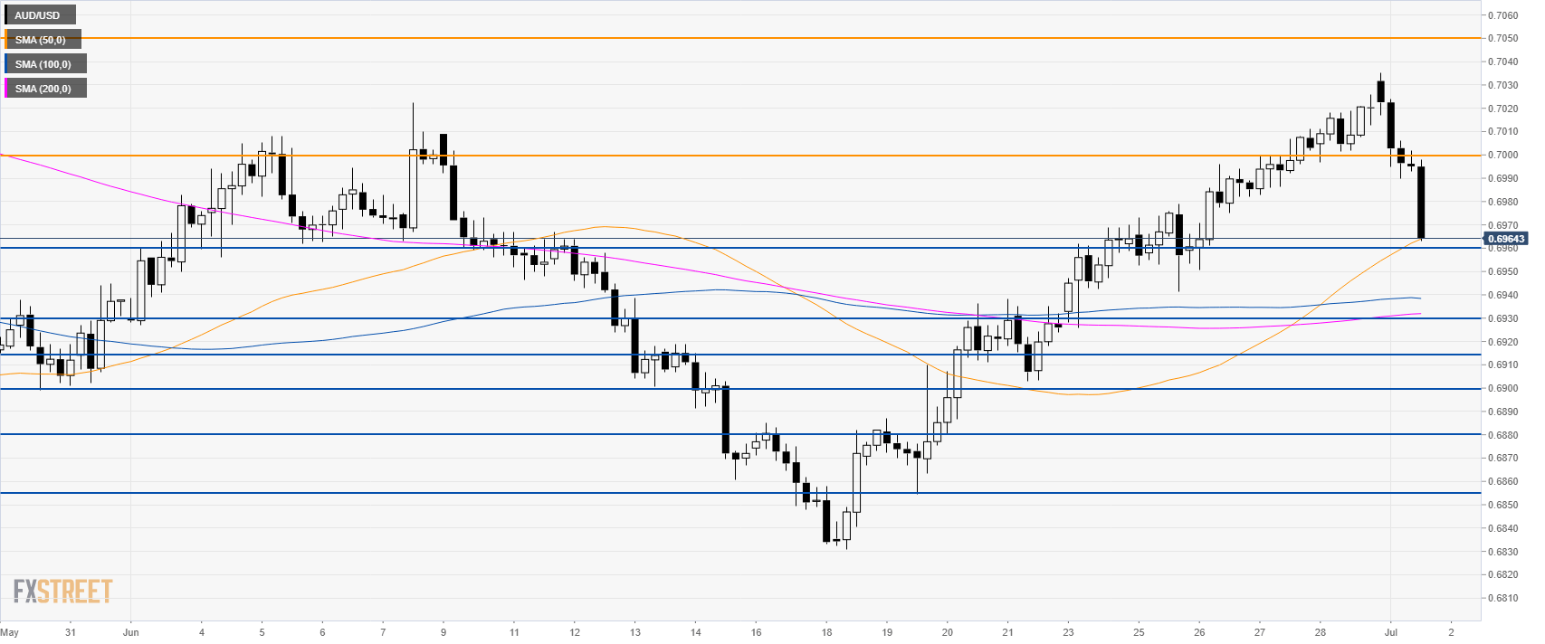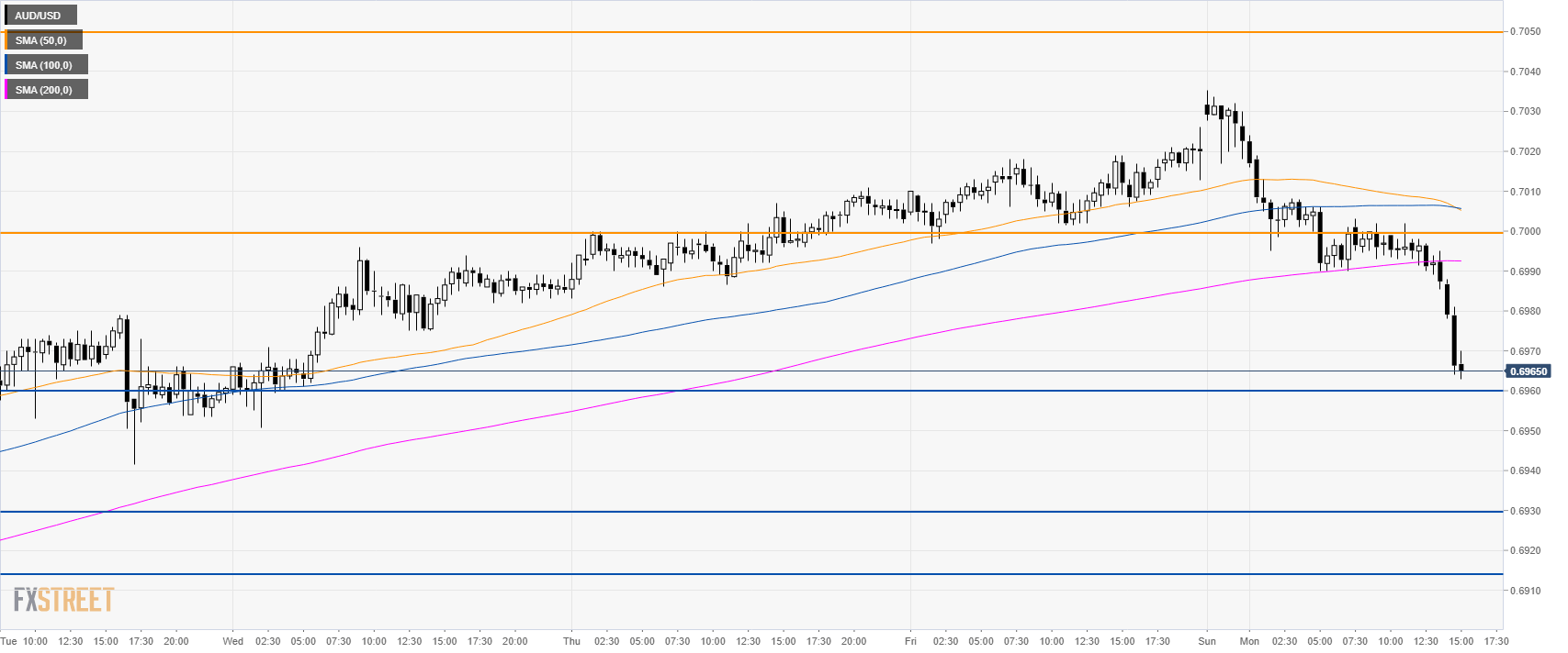 - AUD/USD is moving down sharply below the 0.7000 figure.