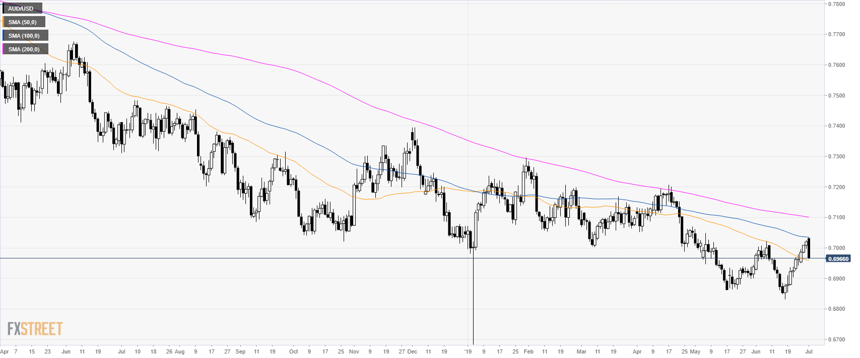 AUD/USD is trading in a bear trend below its 100 and 200-day simple moving averages (DSMAs). The market is trading below the 0.7000 mark.