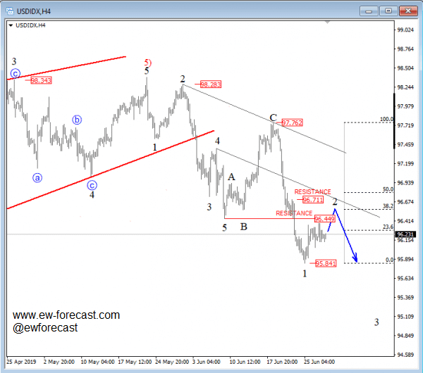 USD Index is dropping nicely, down from 97.76 level where a bigger corrective A-B-C structure had found resistance. The current drop is now part of a bigger, five-wave cycle that can take price towards, and below the 95.0 regions. That said, be aware of temporary setbacks which may show up during current downtrend; wave 2 with possible resistance near 96.45/96.711 region.