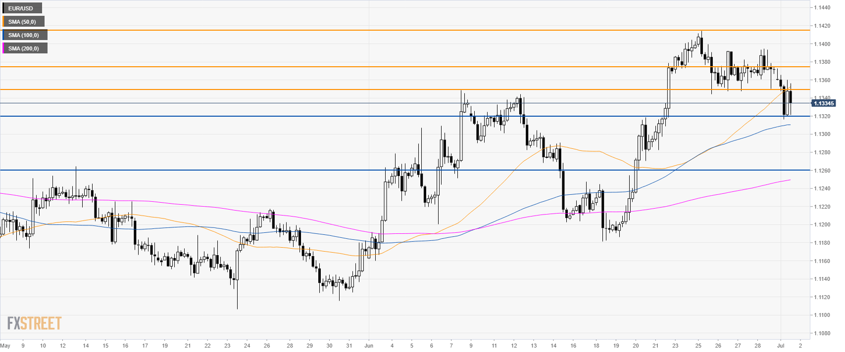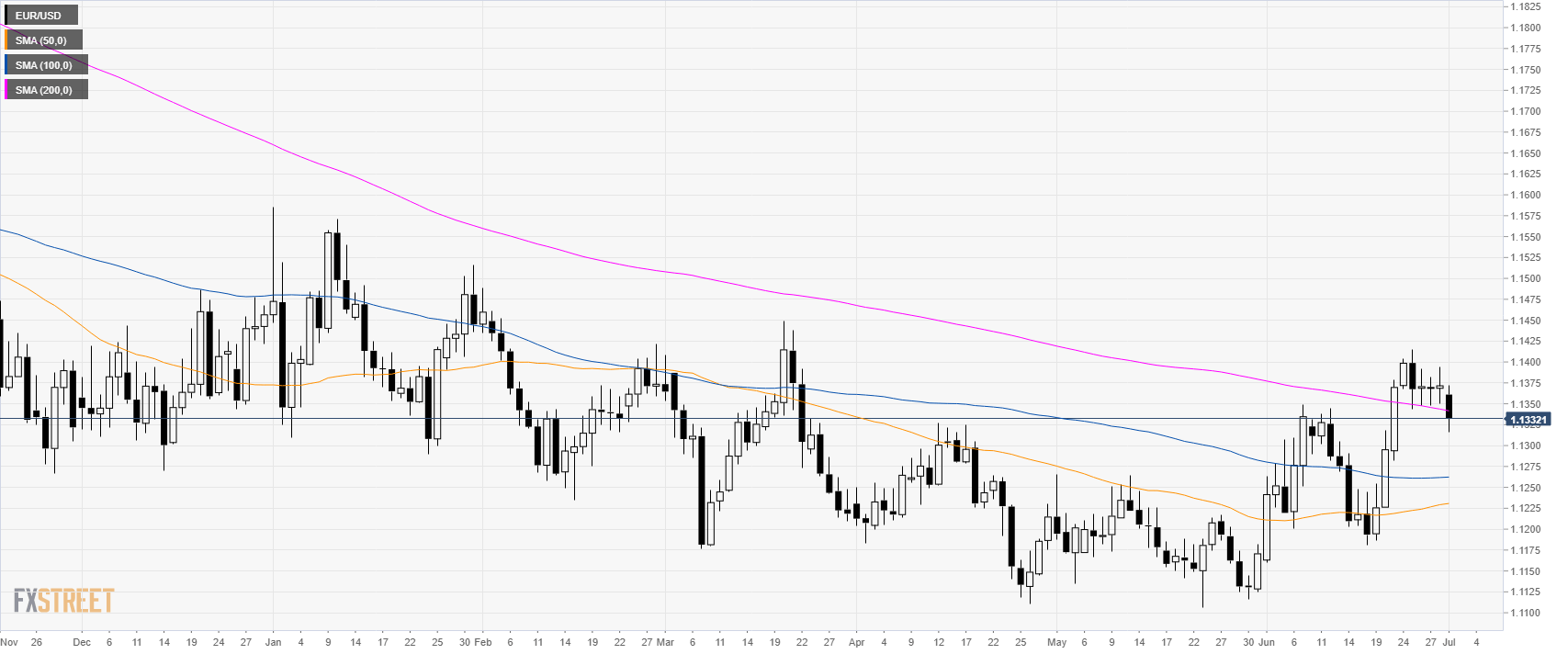 EUR/USD is losing steam from recent tops made near the 1.1400 figure. The market is trading below the 200-day simple moving average (DSMA).