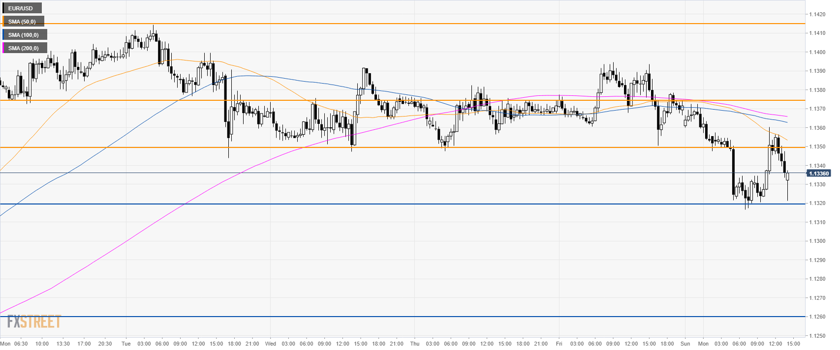 The market broke below 1.1348 support and the 50 SMA. EUR/USD is now testing 1.1320 support. If broken to the downside, the next support can be seen at 1.1260, according to the Technical Confluences Indicator.