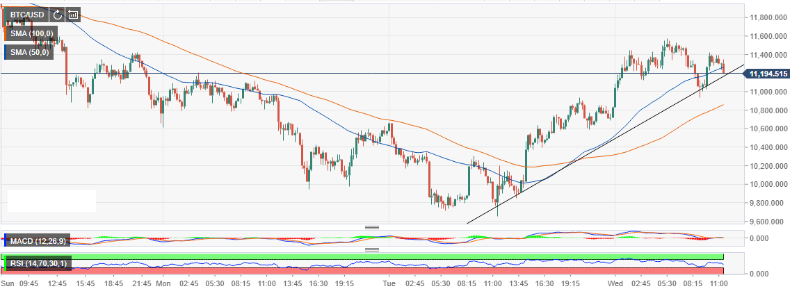 A slight correction from the intraday high found support at $11,000 coinciding with the short-term ascending trendline. BTC/USD is trading at $11,200 with the first resistance at $11,400. In order to assault $12,000 hurdle, the resistance at $11,600 must be cleared.