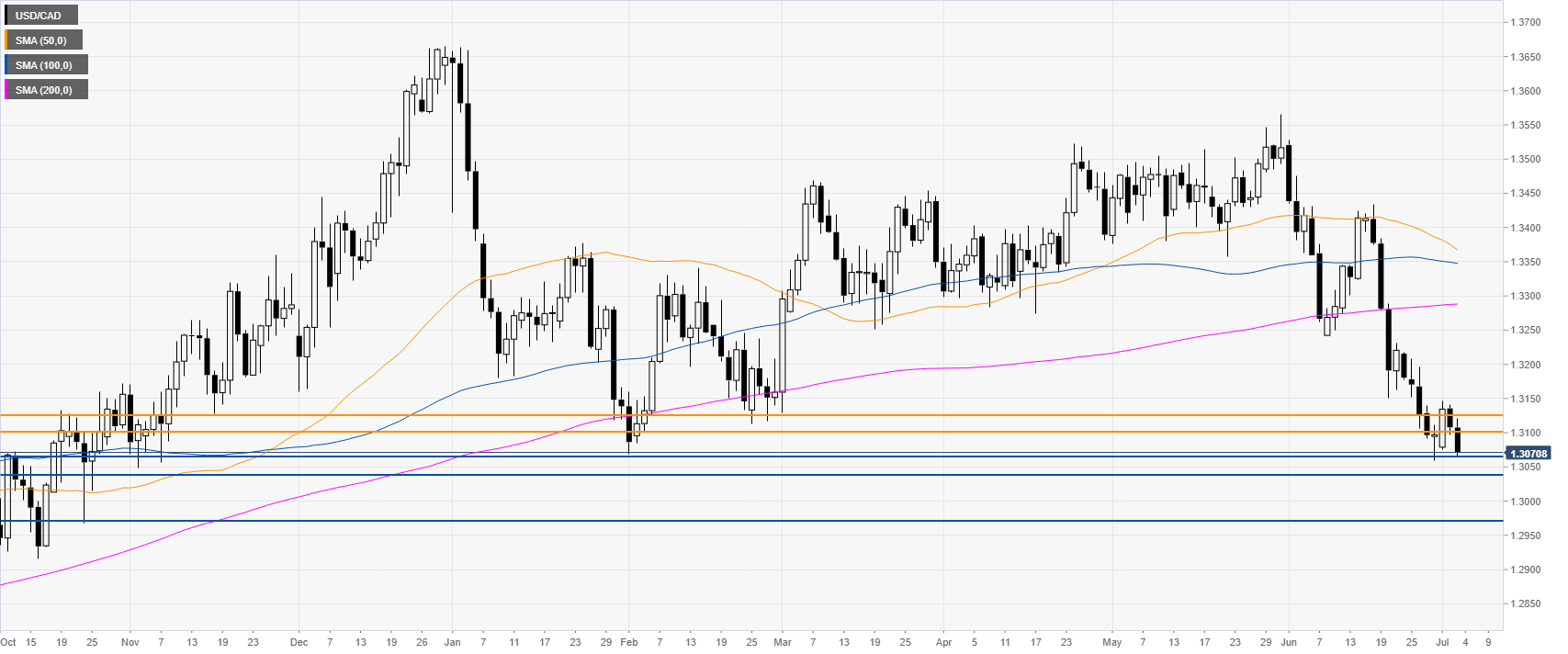 USD/CAD is under pressure below the main SMAs. If the market break below 1.3064 support, the next levels to the downside can be seen at 1.3037 and 1.2969.