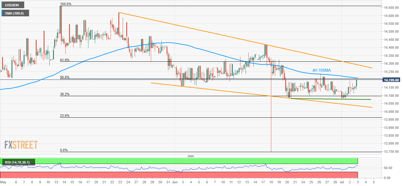 Despite gradually recovering from short-term horizontal support, the USD/IDR pair needs to cross immediate resistance-confluence to justify its strength as it takes the bids near 14,200 during early Wednesday.