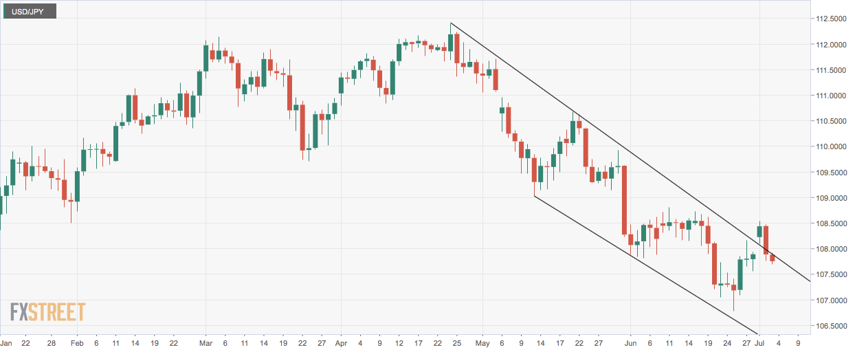 Technically speaking, Tuesday’s drop invalidated the bullish view put forward by the falling channel breakout confirmed by Monday’s close at 108.