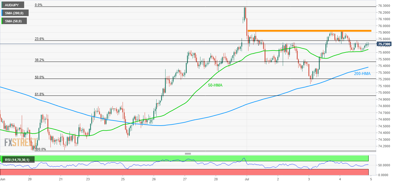 AUD/JPY remains firm above 50-hour moving average (HMA) as it takes the rounds to 75.75 during the early Asian session on Friday.