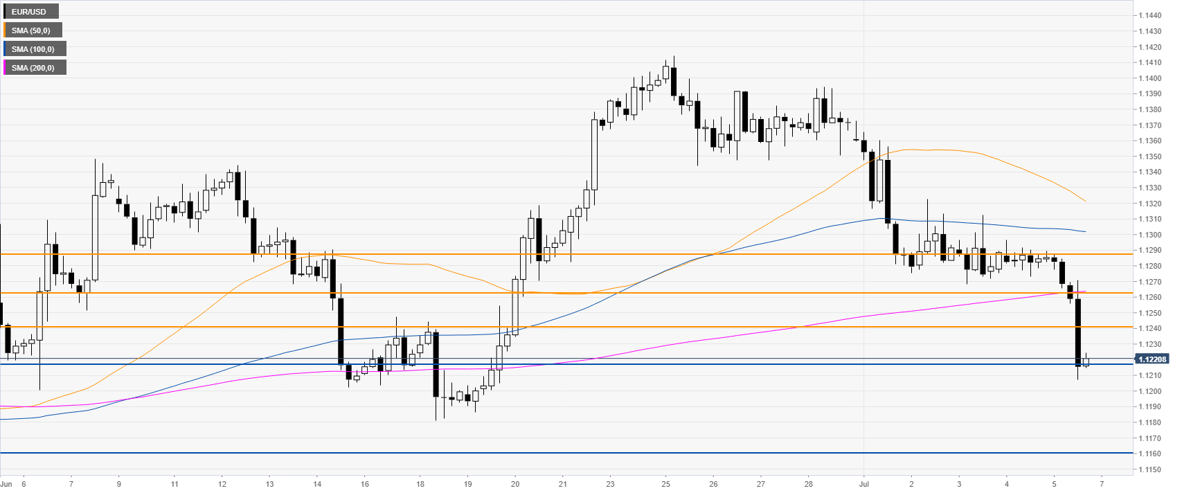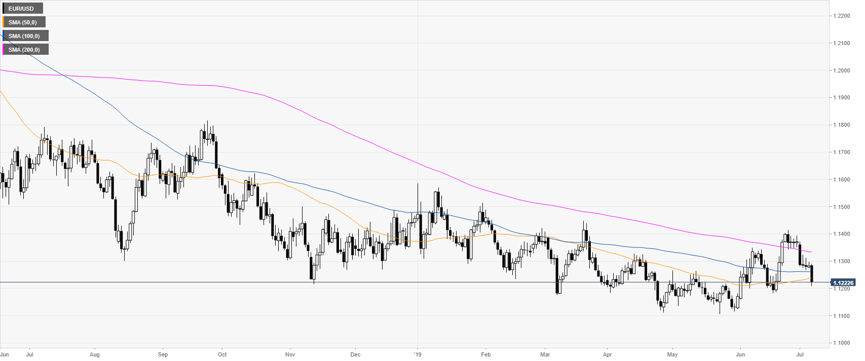 EUR/USD is trading below its main daily simple moving averages (DSMAs). The June’s Nonfarm Payrolls was the best reading since January. The US economy added 224K jobs vs. 160K. As a result, analysts think that the Federal Reserve might be less agressive in cutting rates.