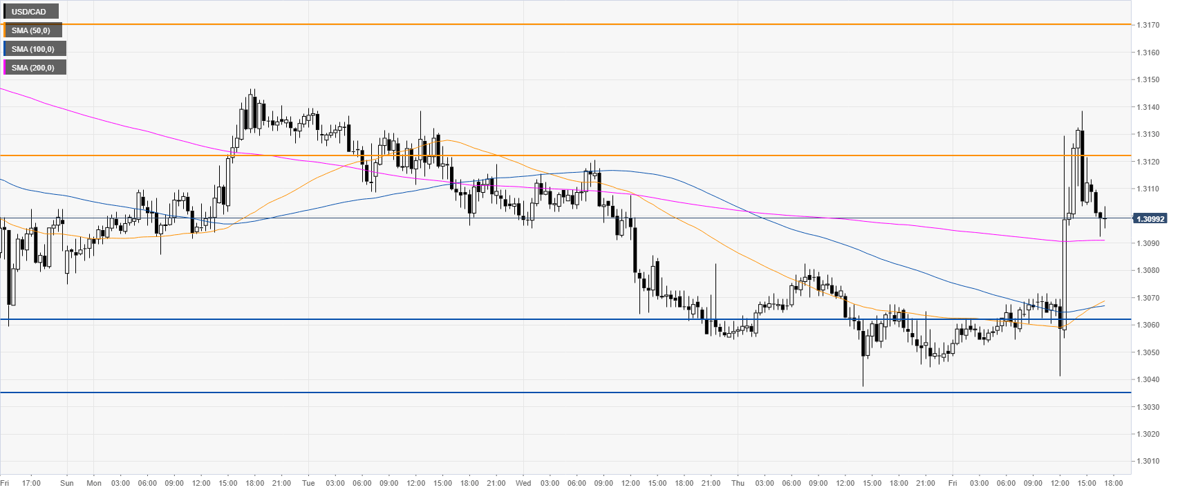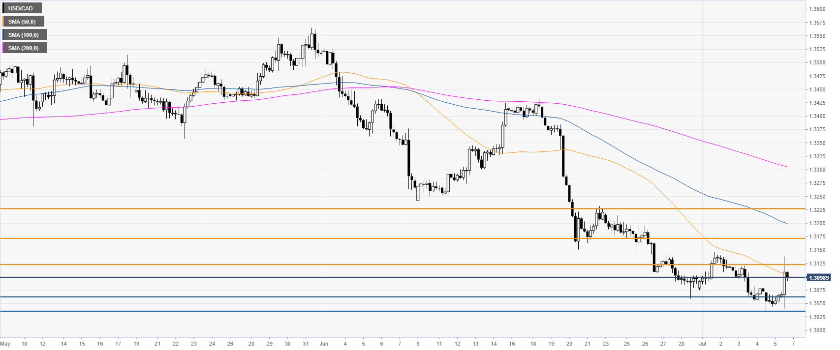 USD/CAD leaped above the 1.3100 figure on the stellar US Nonfarm Payrolls. The market is now hovering around this level and the 50 SMA. The level to beat for bears is 1.3060 and 1.3055.