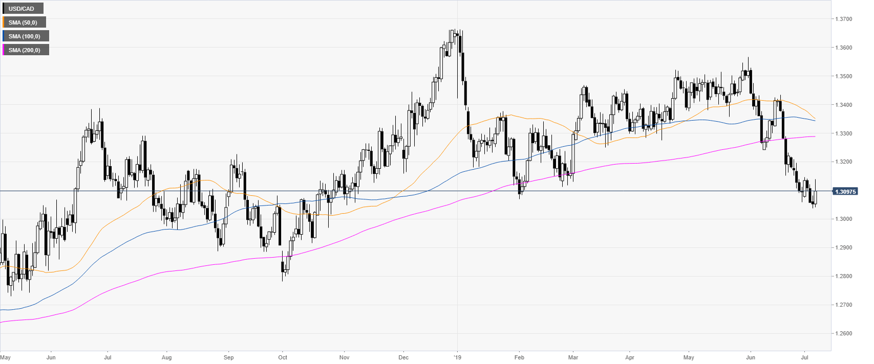 USD/CAD is hovering near multi-month lows as the market is trading below its main daily simple moving averages (DSMAs).