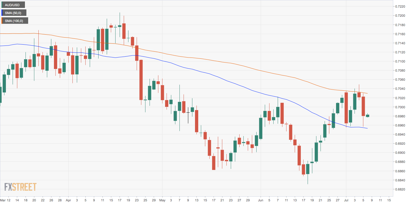 - AUD/USD is trapped between the 50- and 100-day MAs.