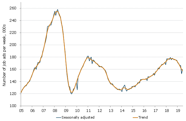 The subsequent jump in job ads in June represents only a partial recovery from that weakness, suggesting that the overall trend is still downwards.