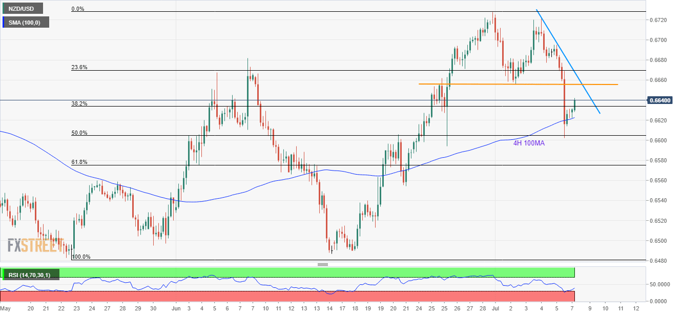 - The NZD/USD pair’s pullback from 50% Fibonacci retracement, 4H 100MA gains support from RSI rise off oversold territory.
