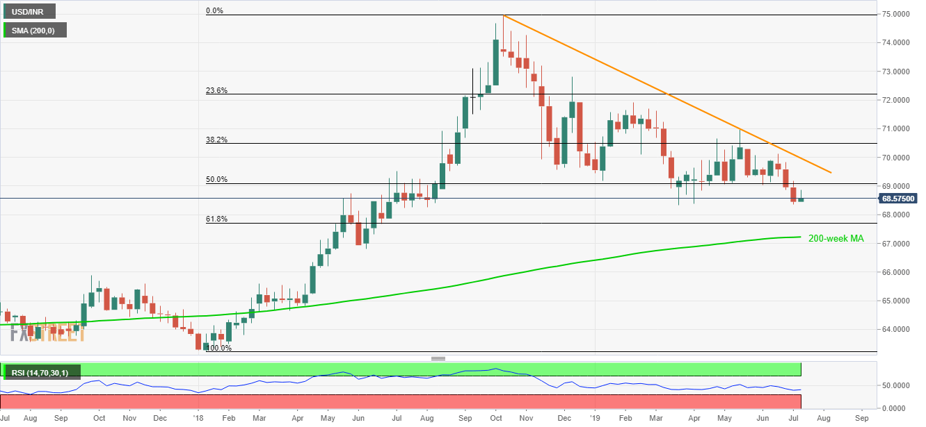 A sustained trading below 50% Fibonacci retracement of the year 2018 upside signals the USD/INR pair’s weakness as it takes the rounds to 68.56 on early Monday.