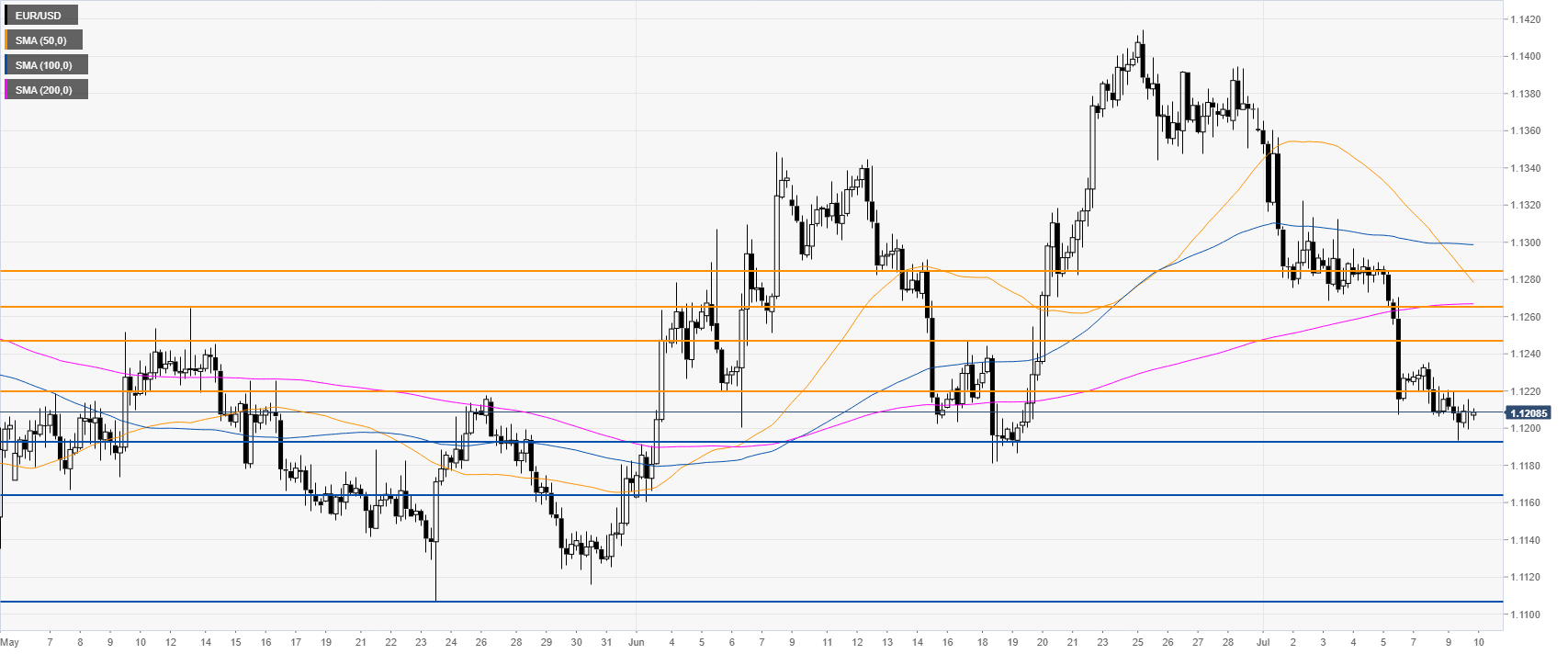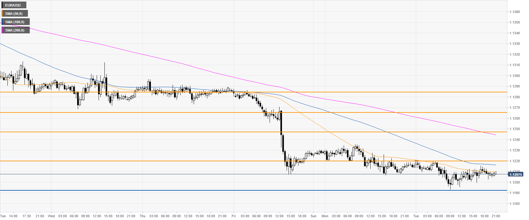 EUR/USD is entering the Asian session below 1.1220 and its main SMAs. Immediate resistances are seen at 1.1220, 1.1246, 1.1265 and the 1.1285 levels, according to the Technical Confluences Indicator.