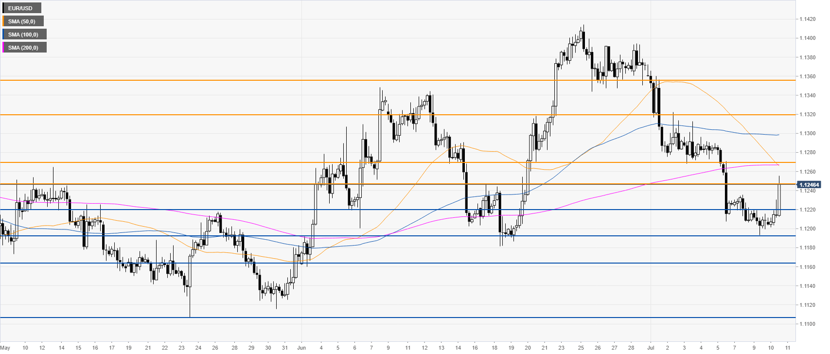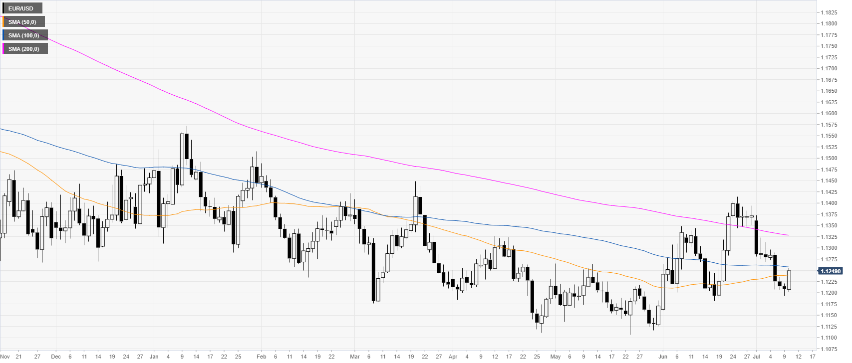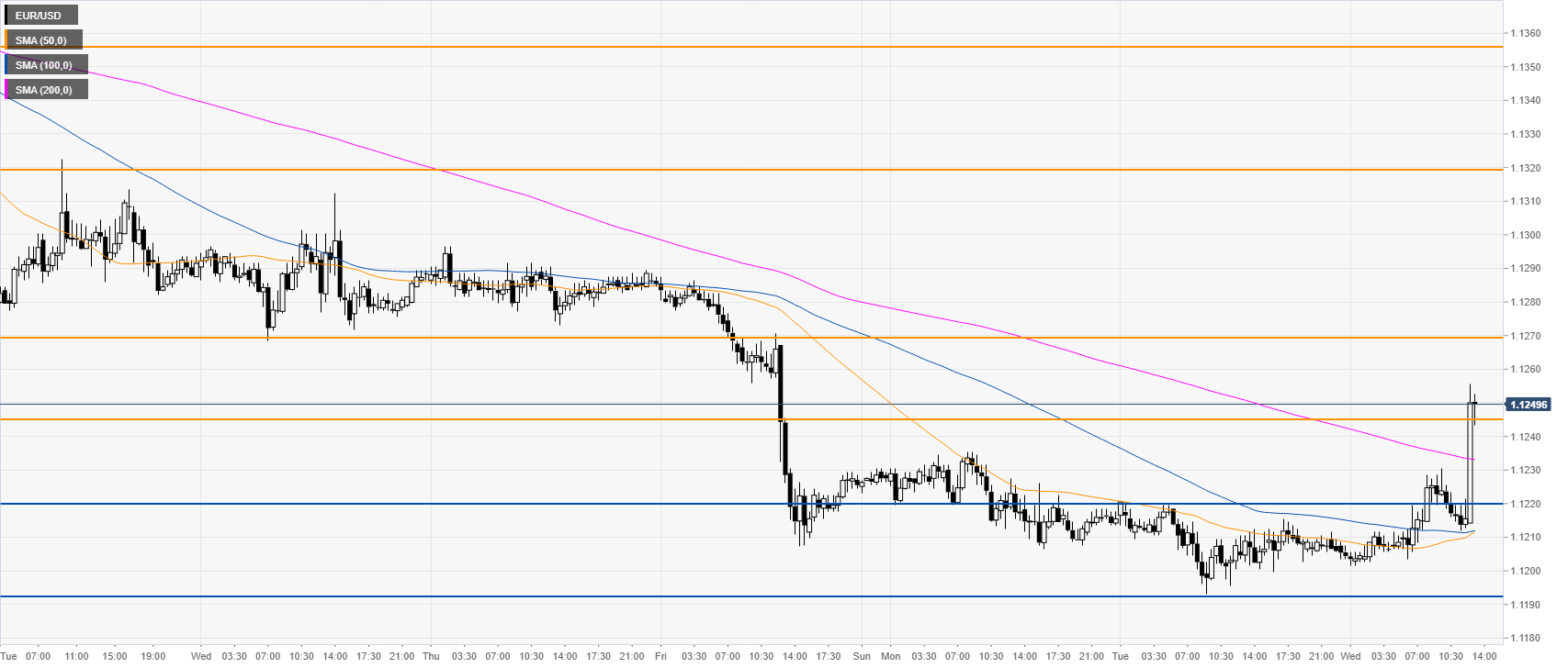 EUR/USD is recovering from the weekly lows as the market is testing 1.1245 resistance. The next main resistance is seen at 1.1270 near the 200 SMA, according to the Technical Confluences Indicator.