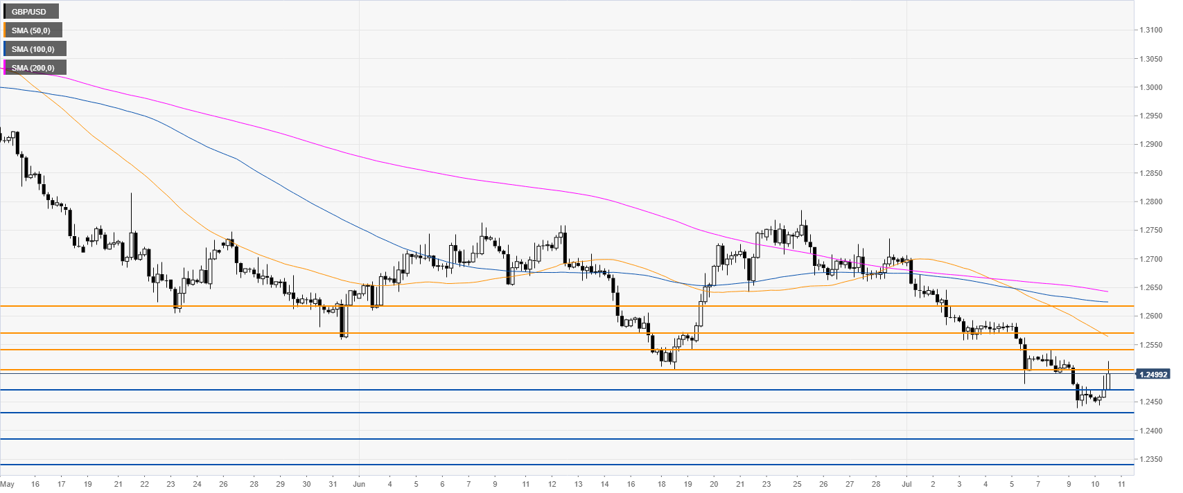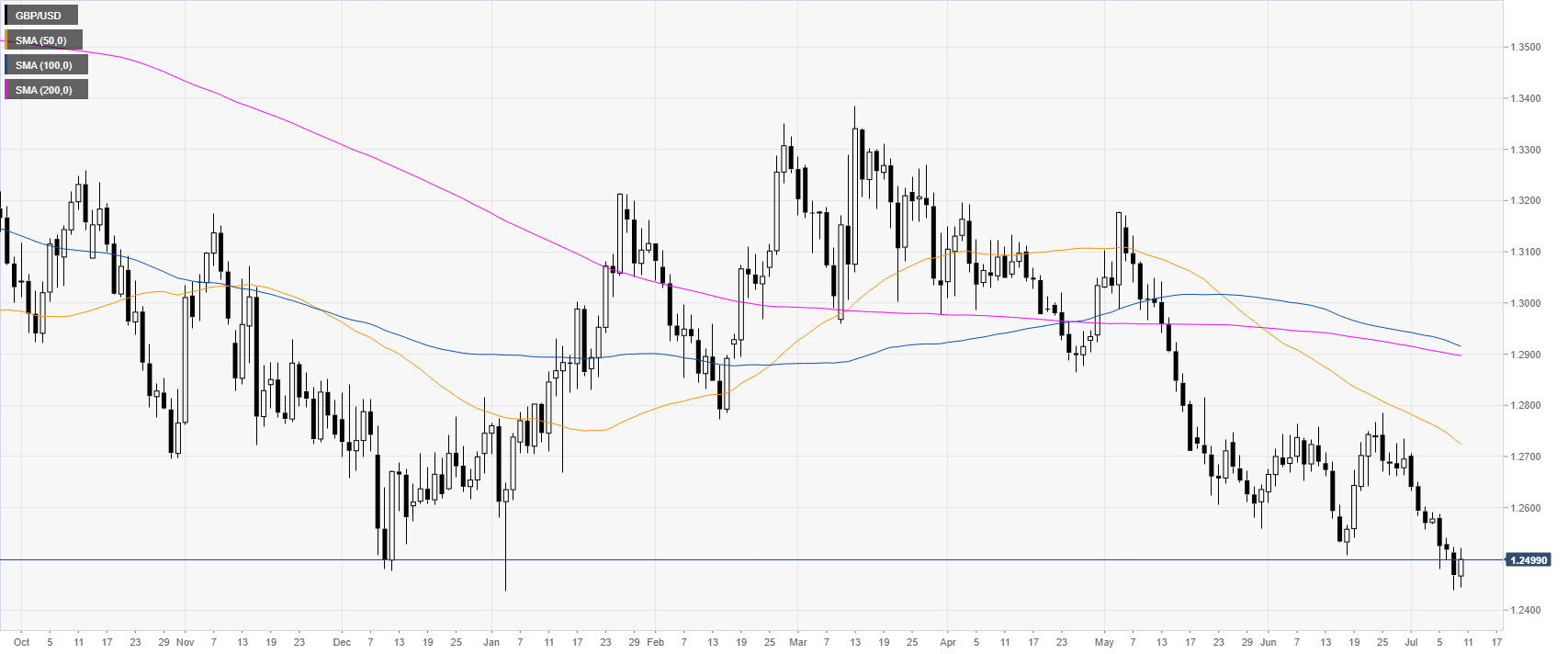 GBP/USD is trading in a bear trend below its main daily simple moving averages (DSMAs). The market has tested Tuesday’s highs after dovish remarks from Fed’s Powell.