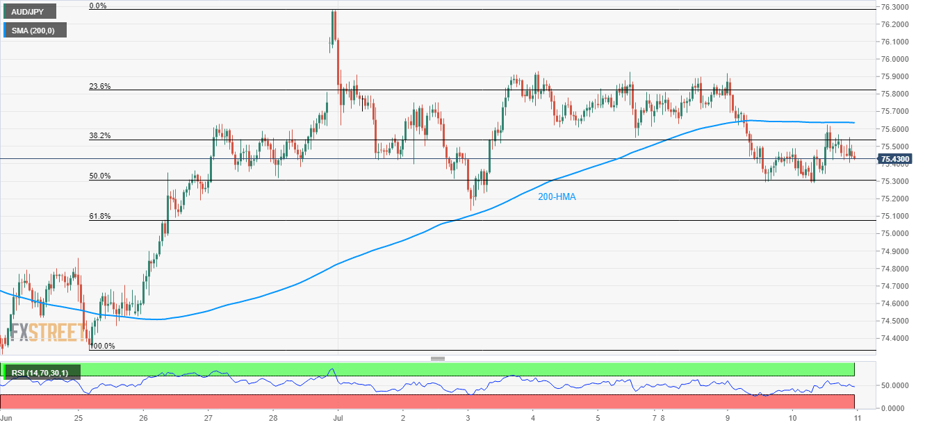 Despite bouncing off 50% Fibonacci retracement of late-June increase, the AUD/JPY pair couldn’t clear 200-hour moving average (HMA) as it drops to 75.43 during early Thursday.