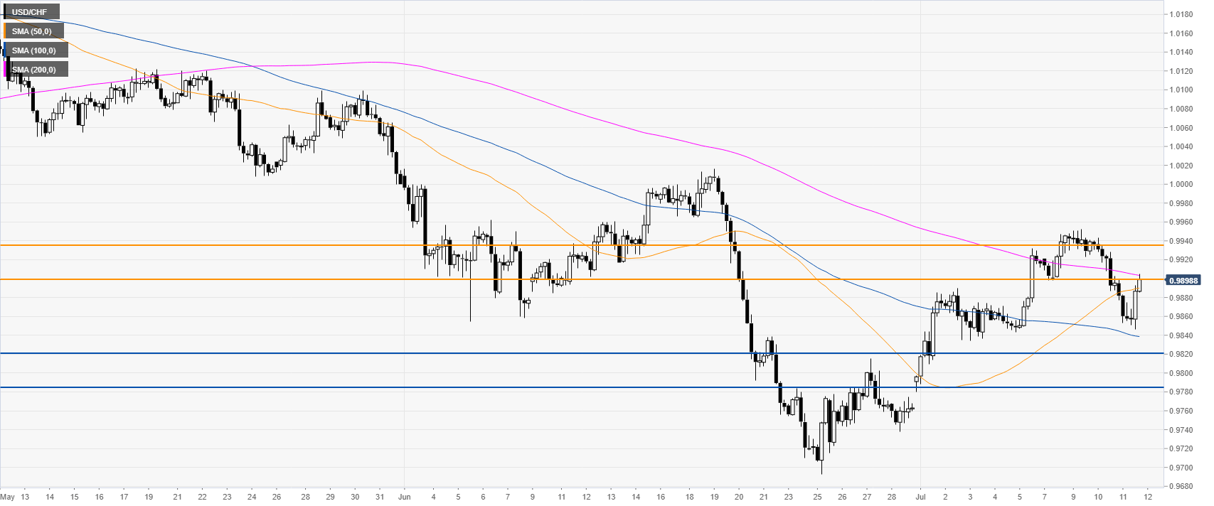 USD/CHF is challenging the 0.9900 handle and the 200 SMA. If broken the next resistance is seen at 0.9935 according to the Technical Confluences Indicator.