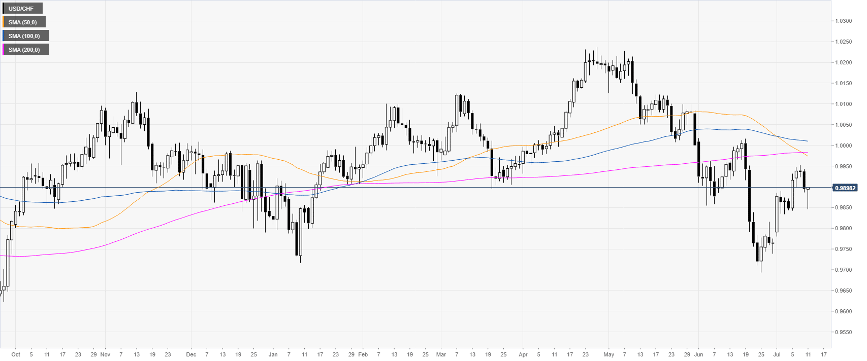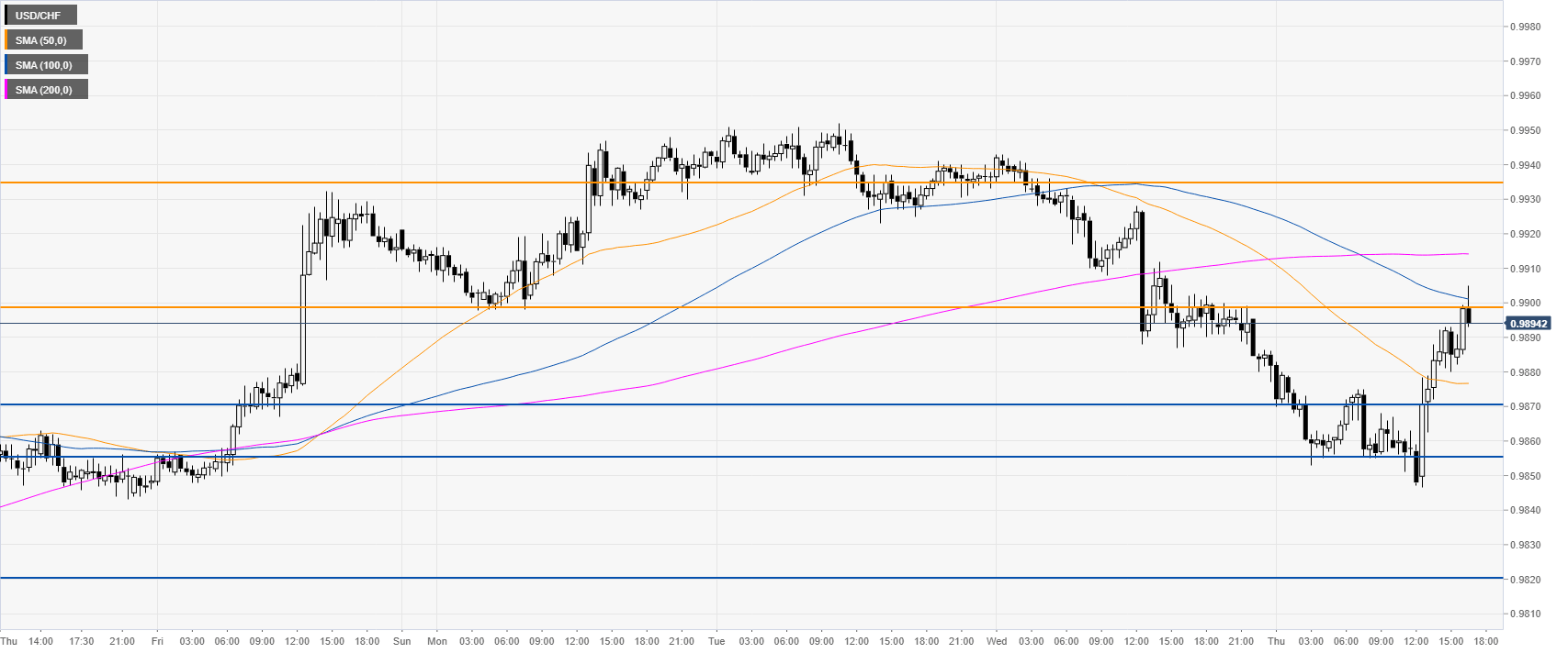 USD/CHF is trading between the 50 and 100 SMAs suggesting a consolidation in the near term. Support is seen at 0.9870 and 0.9855, according to the Technical Confluences Indicator.