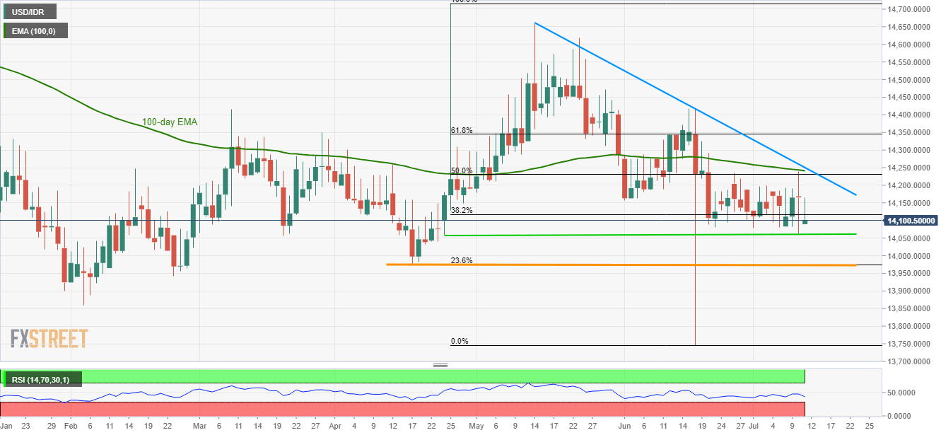 Despite bouncing off late-April lows, the USD/IDR pair couldn’t cross 100-day exponential moving average (EMA) as it takes the rounds to 14,100 during early Thursday.