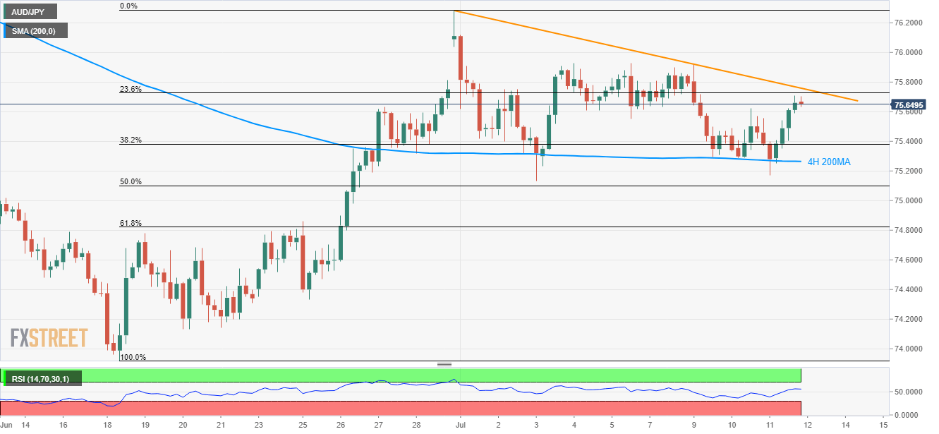 With its sustained trading beyond 200-bar moving average on the 4-hour chart (4H 200MA), backed by momentum indicator, the AUD/JPY pair takes the rounds to 75.66 during the early Asian session on Friday.