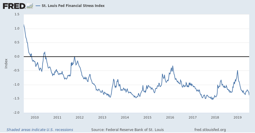 The degree of financial stress in the markets, as represented by St. Louis Fed’s Financial Stress Index, eased to -1.377 in the week ended July 5 – its fourth straight weekly decline.
