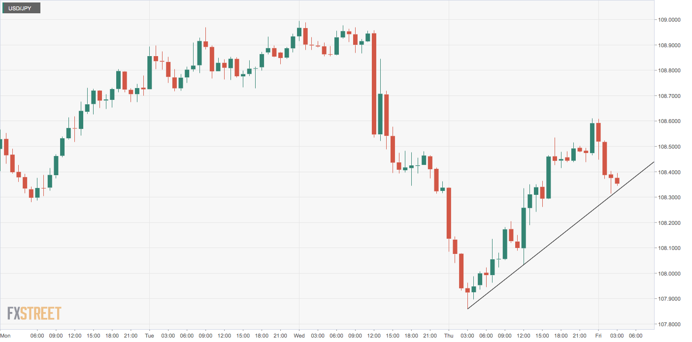 The Japanese Yen picked up a bid earlier today, pushing the USD/JPY pair down to 108.31 – support of the rising trendline on the hourly chart.
