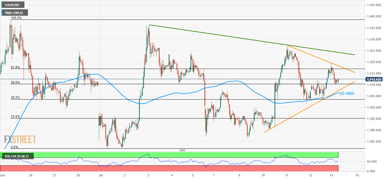 While U-turn from 50% Fibonacci retracement of late-June swing highs to early-July swing lows favors the quote’s rise towards 61.8% Fibonacci retracement near $14,17, short-term descending trend-line at $1418.30, followed by 12-day old downward sloping resistance-line at $1424, can question the bullion buyers.