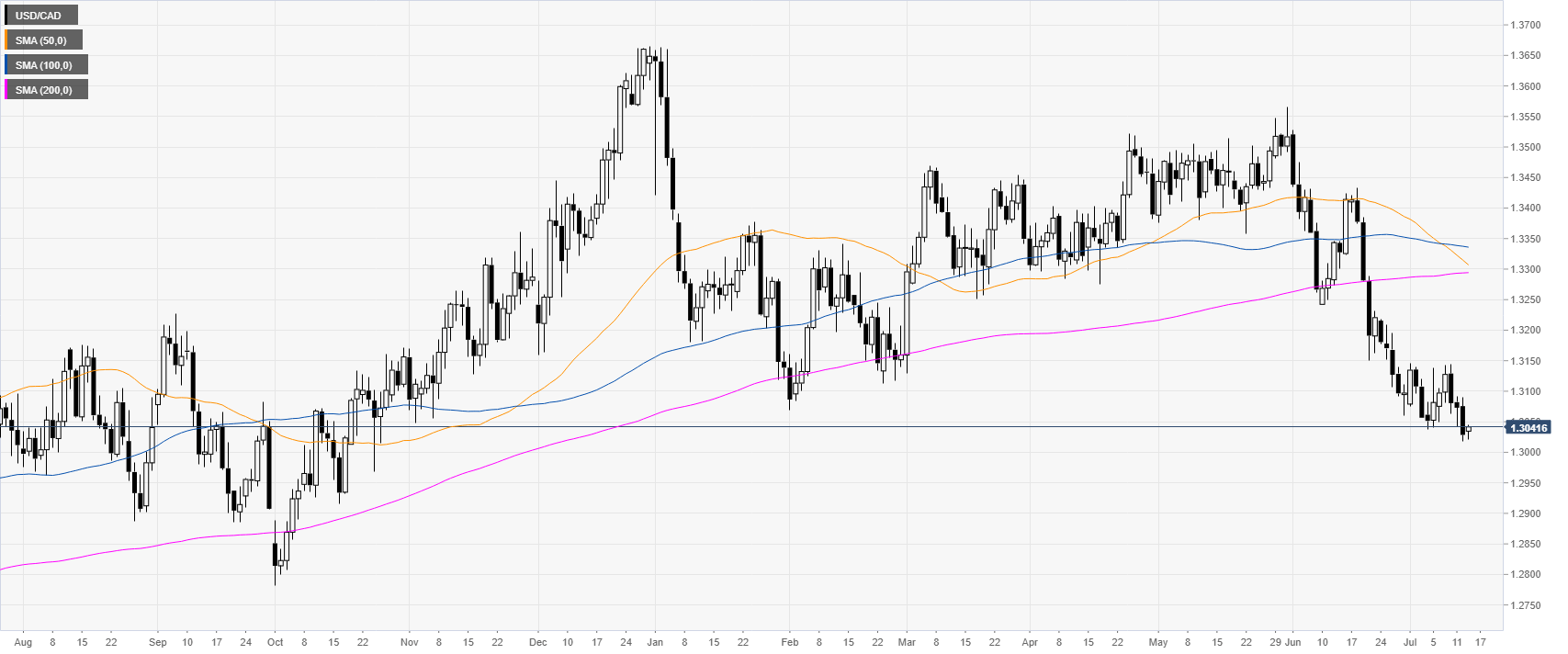 USD/CAD is trading near multi-month lows as the market is trading below the main daily simple moving averages (DSMAs).