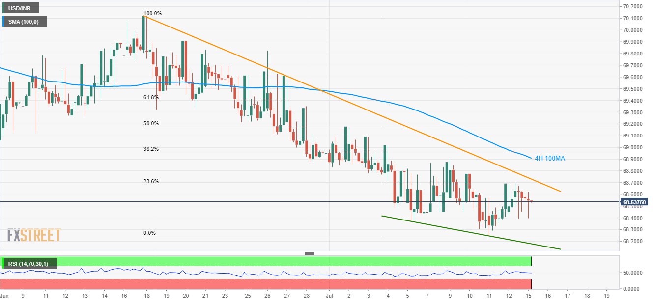In addition to the pair’s sustained trading below a month-long resistance line and 100-bar moving average on the 4-hour chart (4H 100MA), the USD/INR pair’s recent U-turn from 23.6% Fibonacci retracement also portrays the quote’s weakness as it takes the rounds to 68.54 during early Monday.