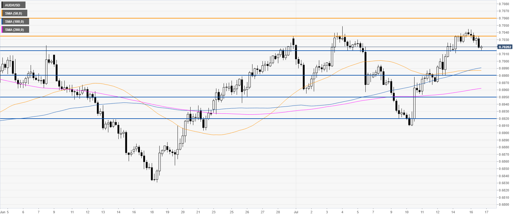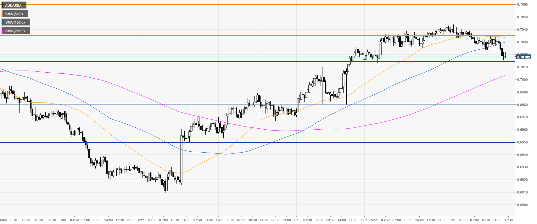AUD/USD is trading below the 50 and 100 SMAs suggesting a consolidation down in the near term. Resistances are seen near 0.7035 and 0.7060 , according to the Technical Confluences Indicator.