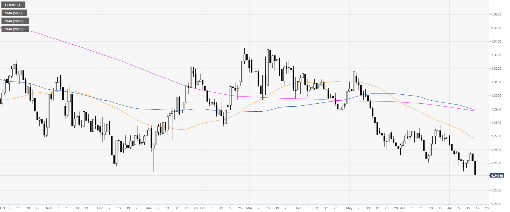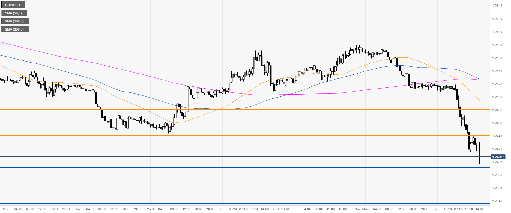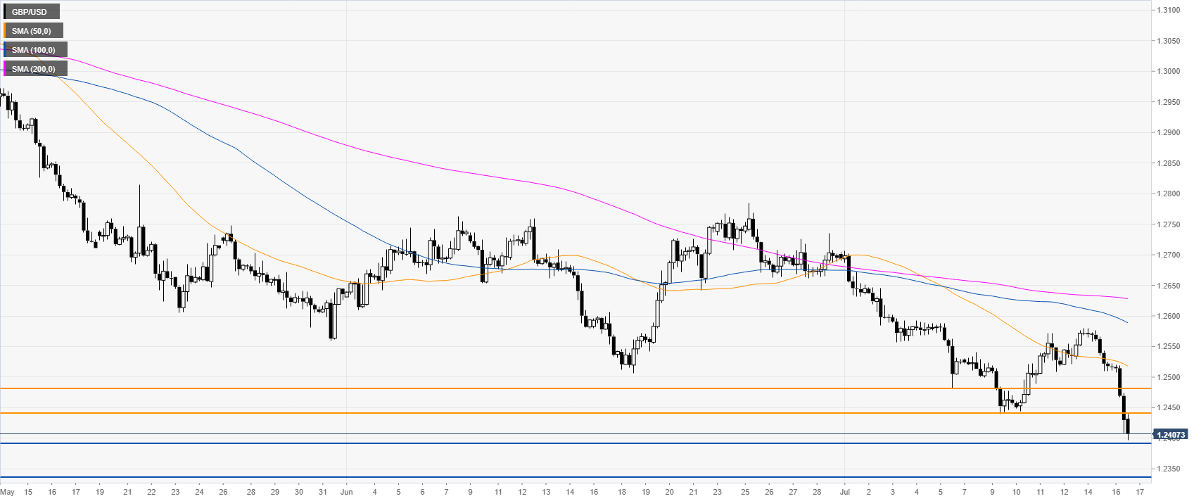 GBP/USD is challenging 1.2400 figure as it is trading in a bear trend below its main daily simple moving averages (DSMAs). The market is under bearish pressure at 27-month lows. Investors will pay attention to the Fed’s Chair Powell speech at 17.00 GMT.