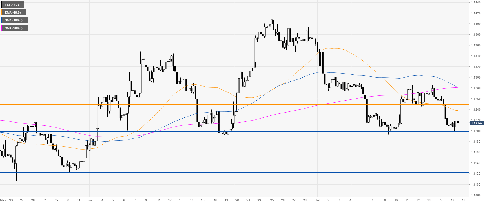 EUR/USD is hovering near the 1.1200 figure below its main daily simple moving average (DSMA).