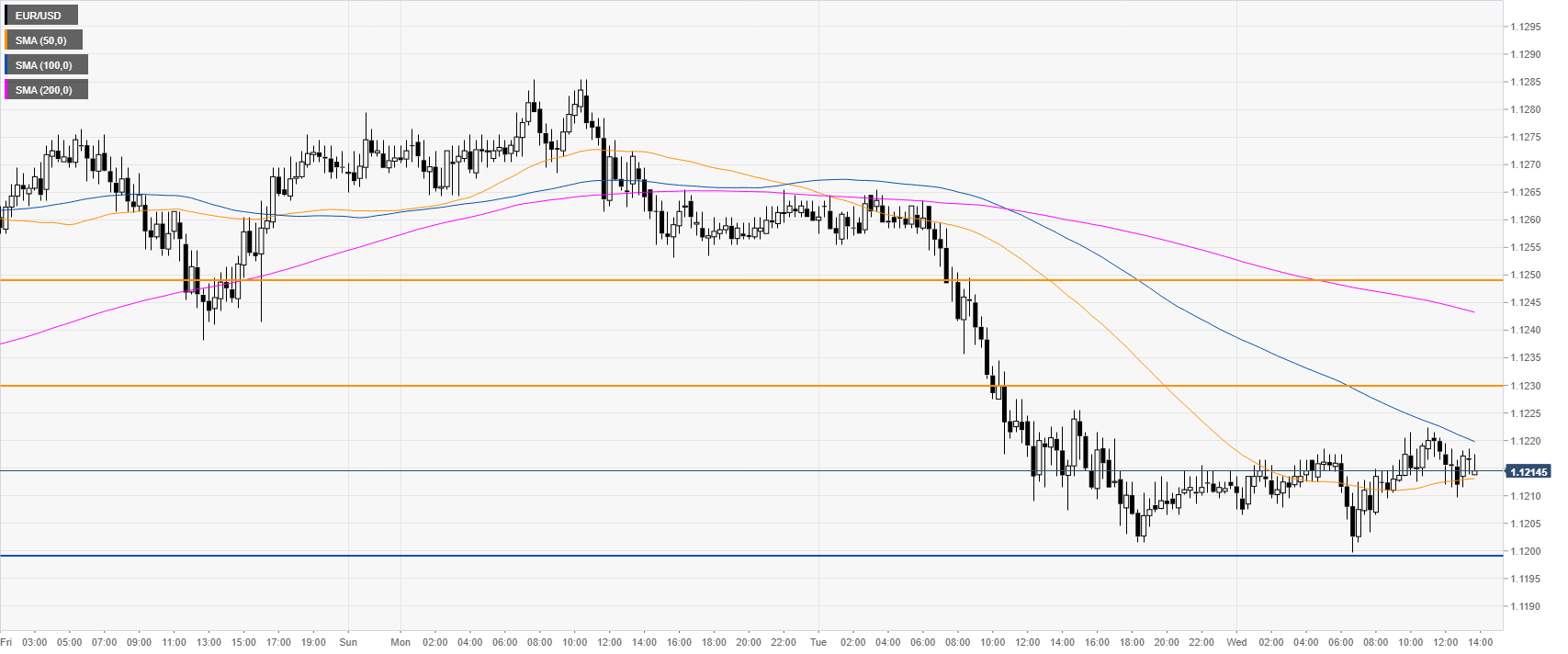 EUR/USD is consolidating losses below 1.1230 resistance and the 100/200 SMAs, all-in-all suggesting a bearish bias. Immediate resistances are seen near 1.1230 and 1.1250, according to the Technical Confluences Indicator.