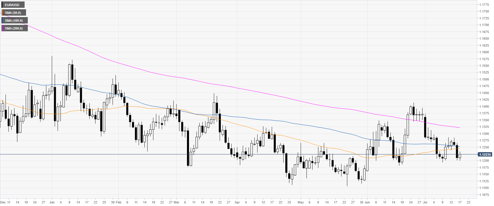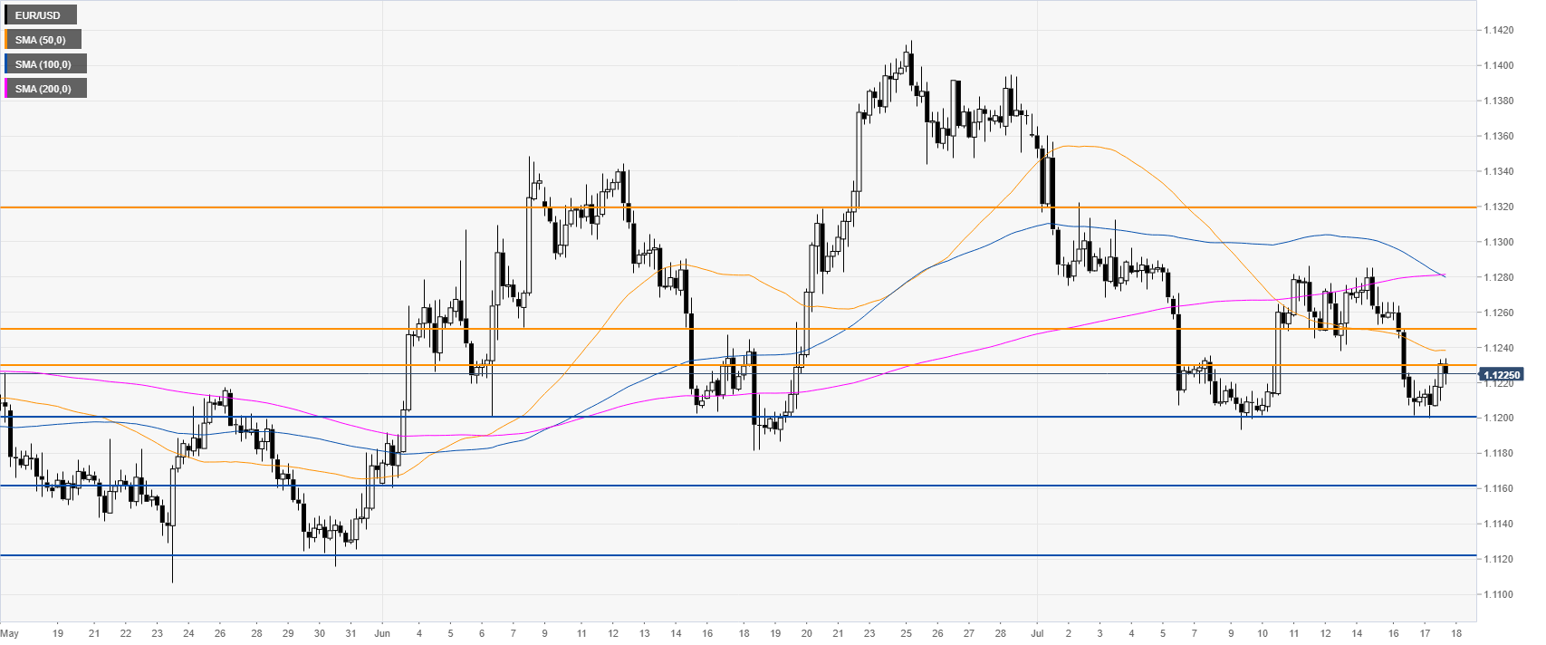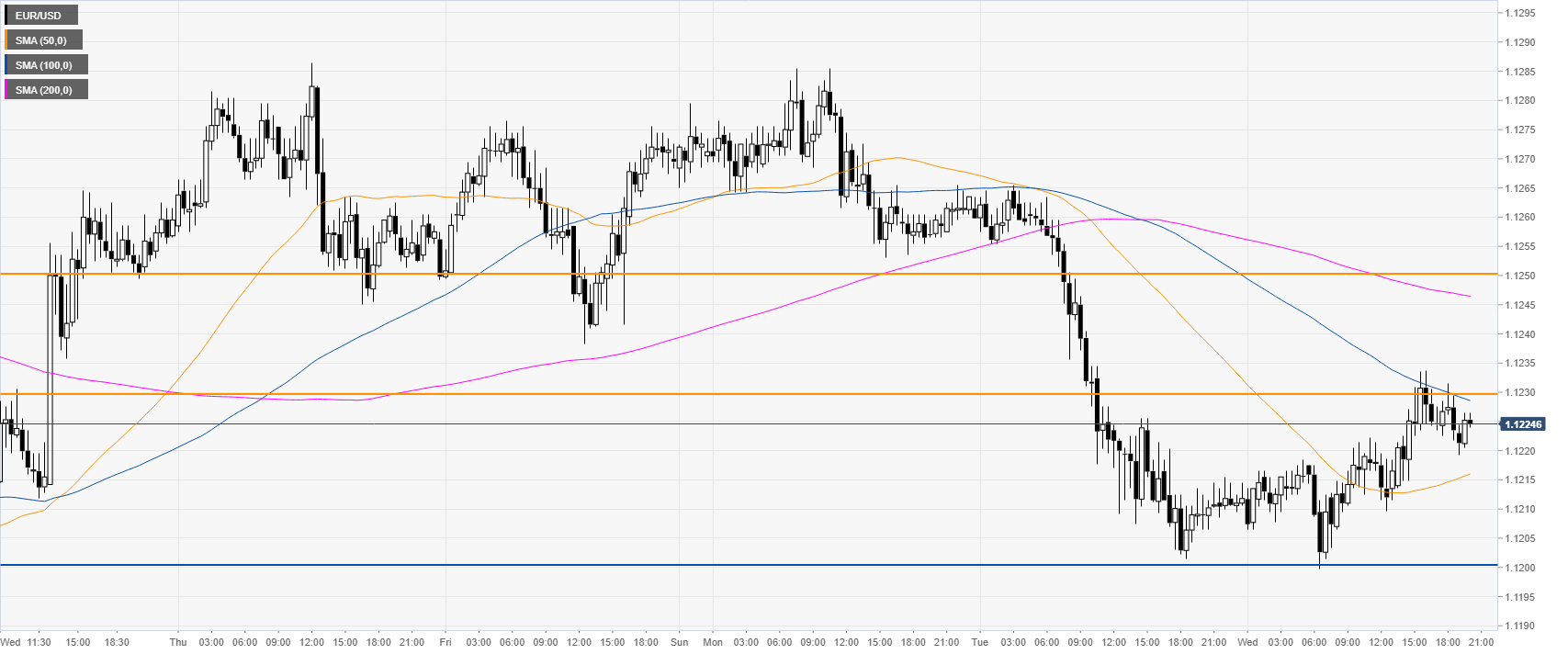 EUR/USD is consolidating the recent losses below 1.1230 resistance and the 100/200 SMAs. Immediate resistances can be seen near 1.1230 and 1.1250, according to the Technical Confluences Indicator.