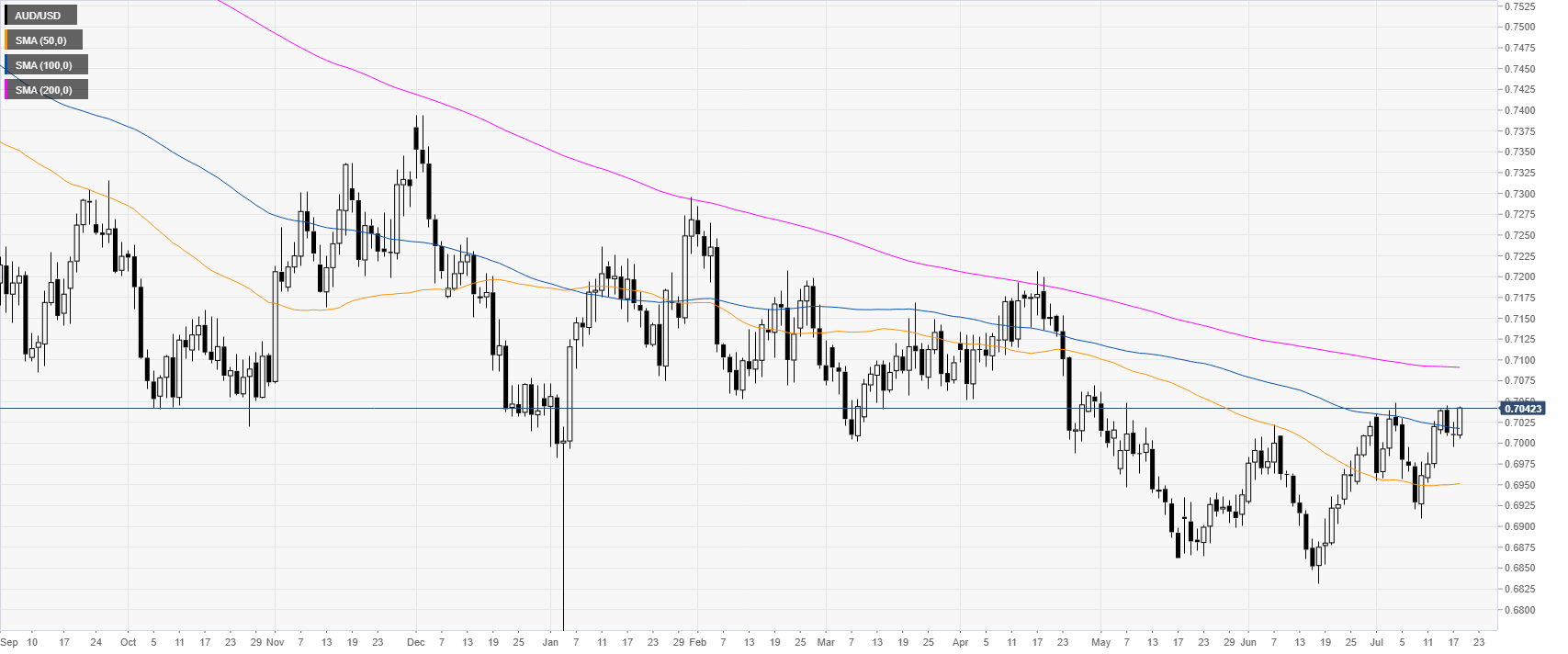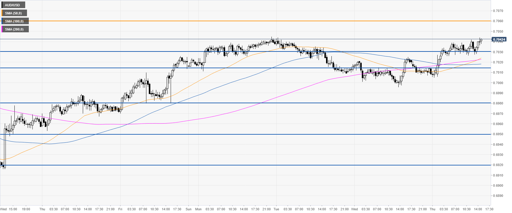 AUD/USD is nearing the July high near 0.7049 as the market is trading above its main SMAs. Bulls can drive the market towards 0.7060 and 0.7100 if they gather enoough steam.