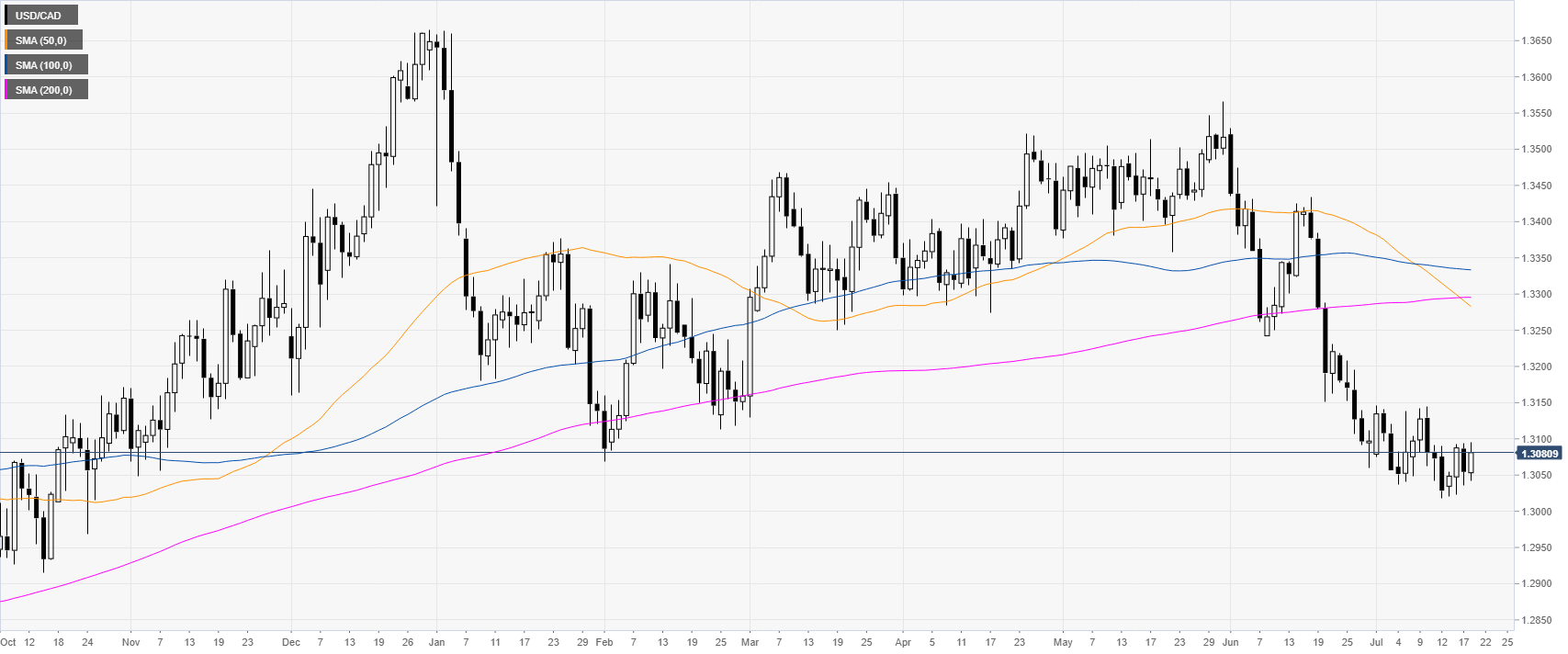 USD/CAD is under bearish pressure near multi-month lows as the market is capped below 1.3100 and the main daily simple moving averages (DSMAs).