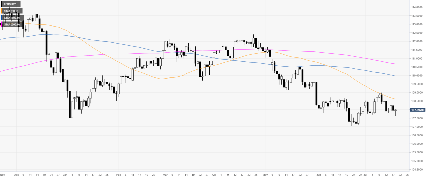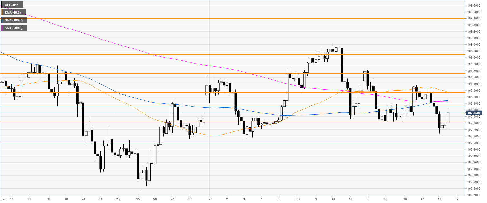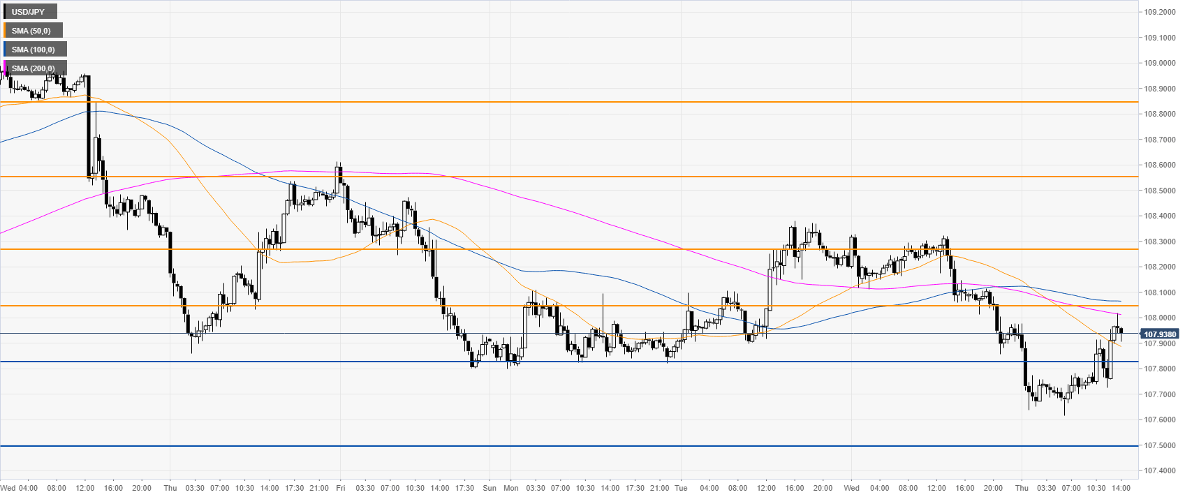 USD/JPY is attempting to find some footing near 108.00 as the market is trading below the main daily simple moving average (DSMA).
