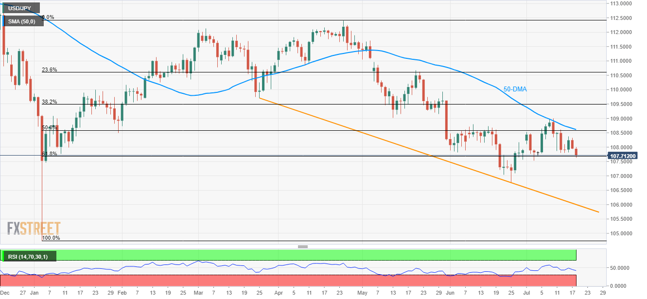Having failed to cross the 50-day moving average (50-DMA) during last-week, USD/JPY chart portrays gradual declines to key Fibonacci retracement level while flashing 107.73 as a quote during early Thursday.
