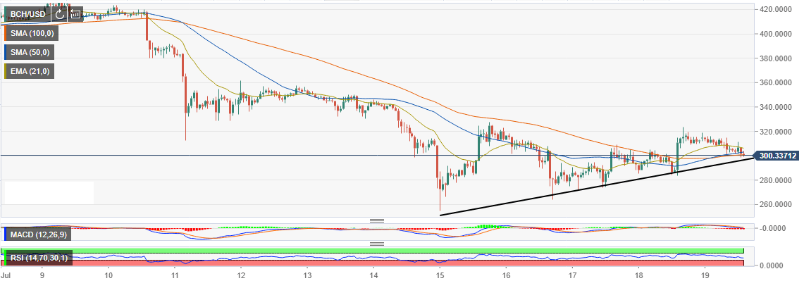 At the time of press, Bitcoin Cash is struggling to hold on to $300. This comes after the price lost ground from the critical resistance at $320. The 100 Simple Moving Average (SMA)1-h is trying to offer support. The immediate upside is limited by the 50 SMA 1-h. More resistance is also coming from the 100 Exponential Moving Average (EMA) currently at $306.45.