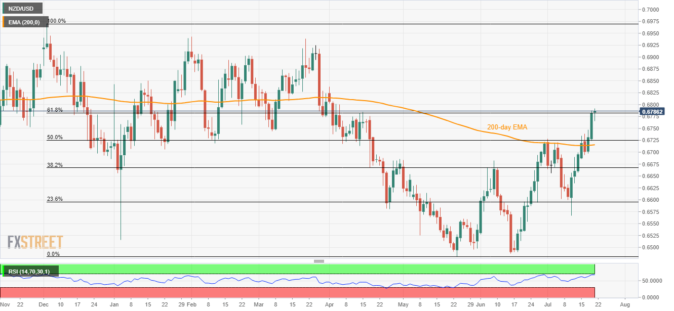 Given the overbought conditions of 14-day relative strength index (RSI), prices can revisit Wednesday’s high should they decline below 61.8% Fibonacci retracement level of December 2018 to May 2019 downpour, at 0.6780.