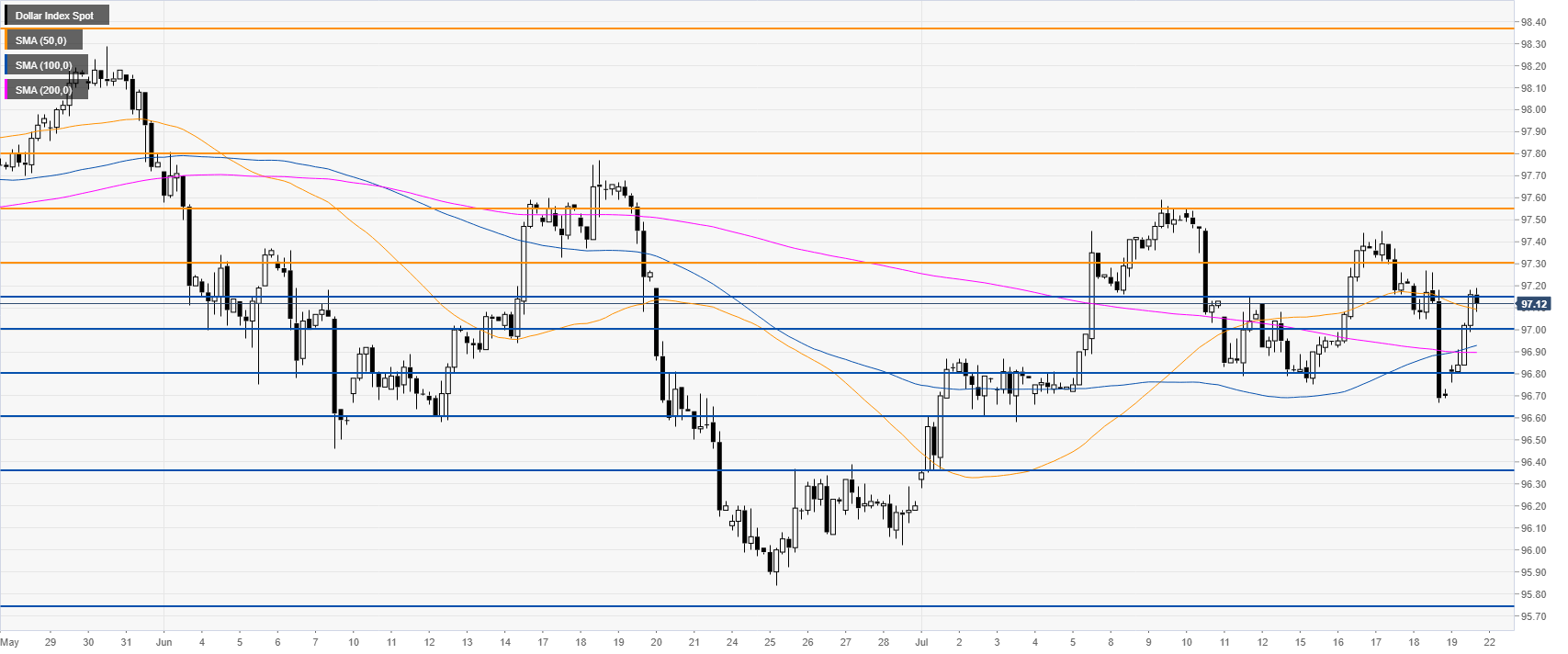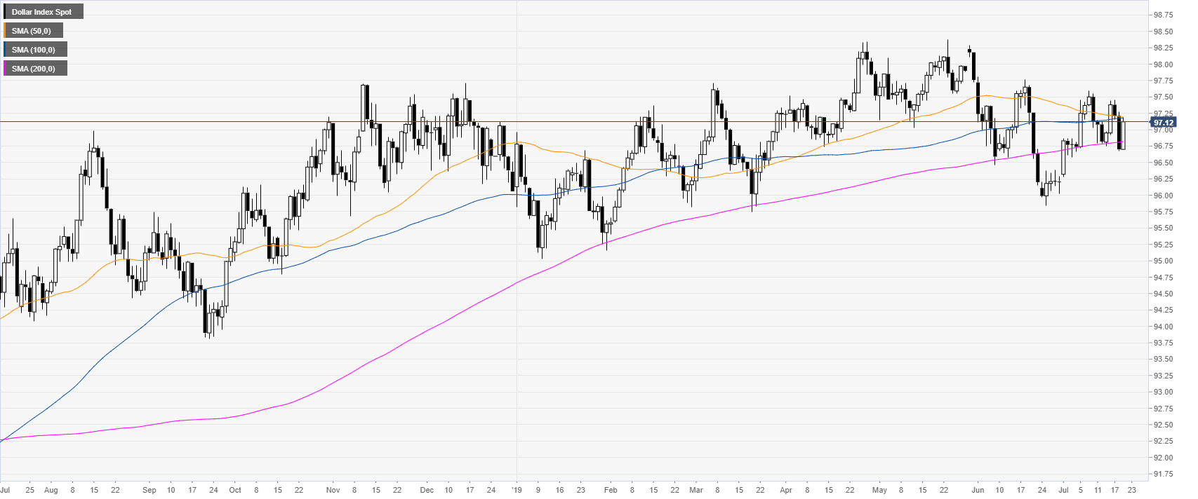 The US Dollar Index (DXY) rebouned near the 200-daily simple moving average (DSMA) as the market is trading above the 97.00 handle. The market is finding resistance near 97.15 where lie the 50 and 100 DSMAs.