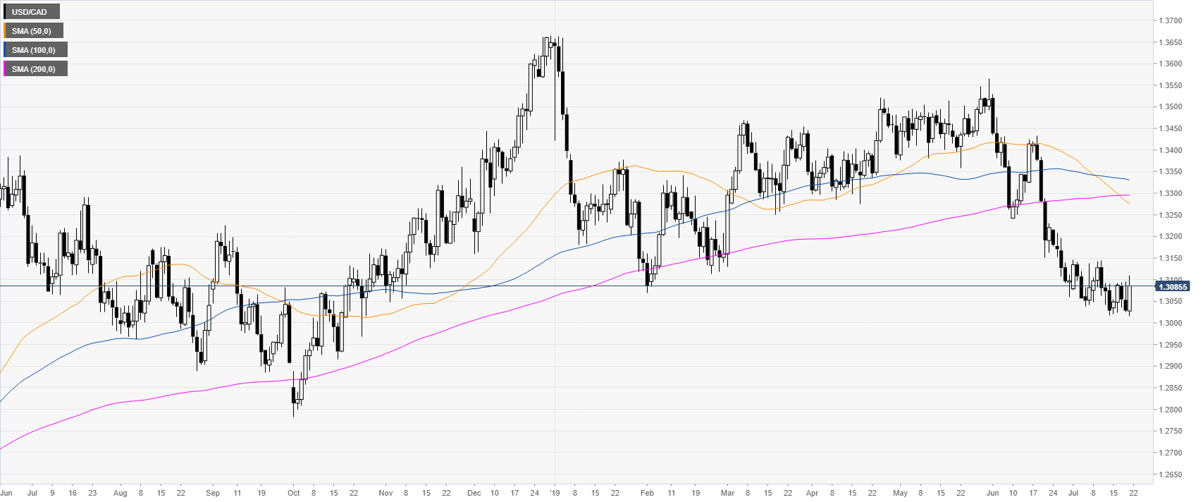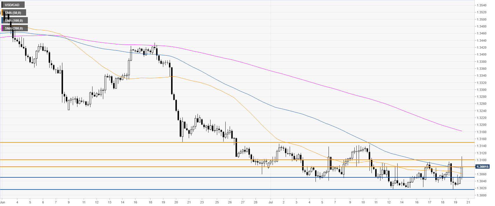 USD/CAD is waveringe near multi-month lows as the market is currently capped below the 1.3100 handle and the main daily simple moving averages (DSMAs). The Canadian Retail Sales in May came below expecation at -0.1% vs. 0.3% forecast, sending the CAD down.