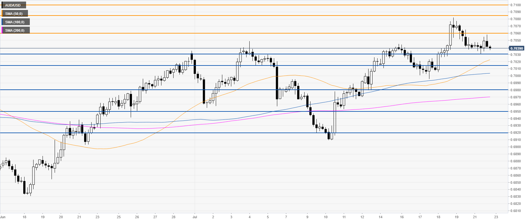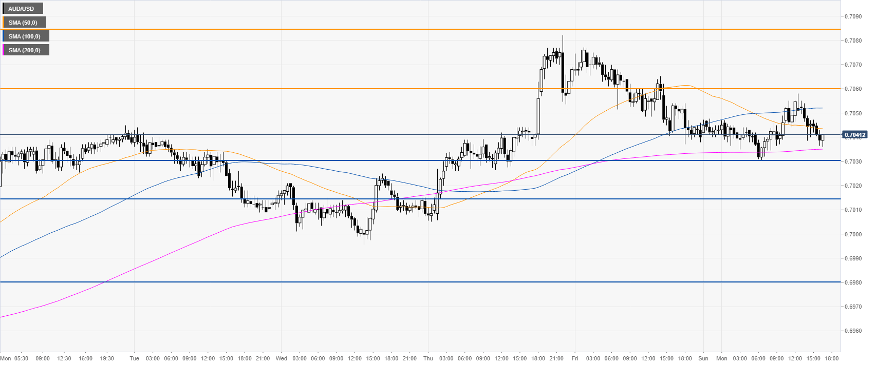 AUD/USD is trading towards the daily lows as the market is challenging the 200 SMA near 0.7035. The market is in a correction down and a break below 0.7030 suport can lead to 0.7015 and 0.6980 level, according to the Technical Confluences Indicator.