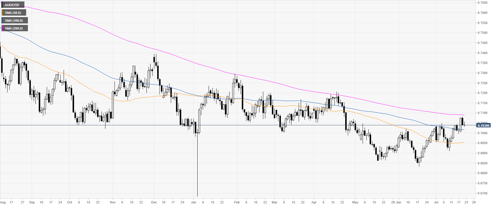 The Aussie is trading in a bear trend below the 0.7100 figure and its 200-day simple moving average (DSMA).