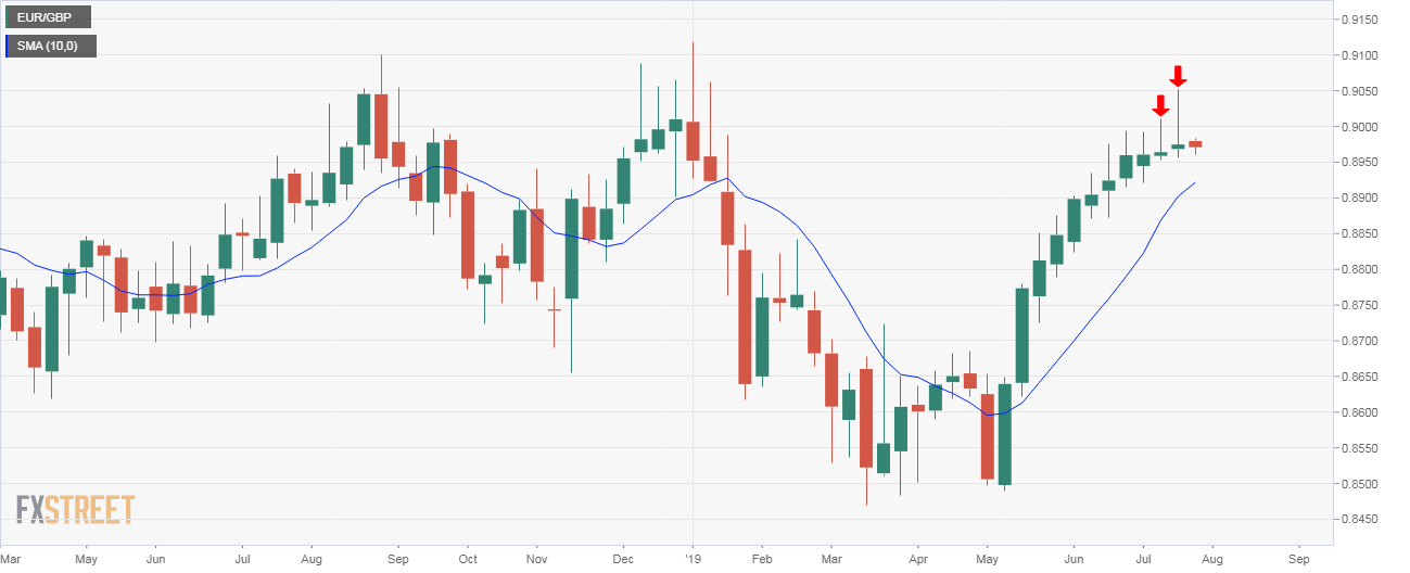 The EUR/GBP bulls are looking exhausted, having engineered an 11-week winning run, and the pair could drop to the 10-week moving average (MA) at 0.8917 in the next couple of days.