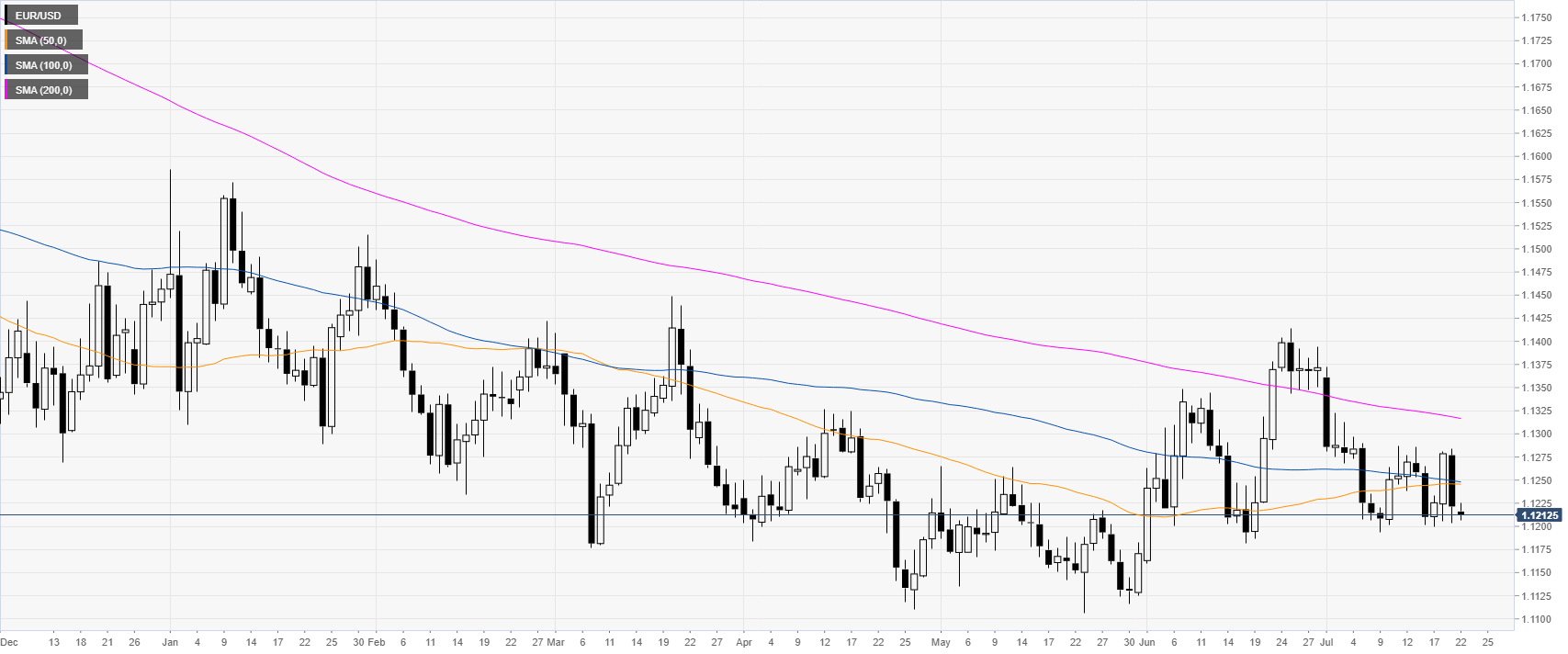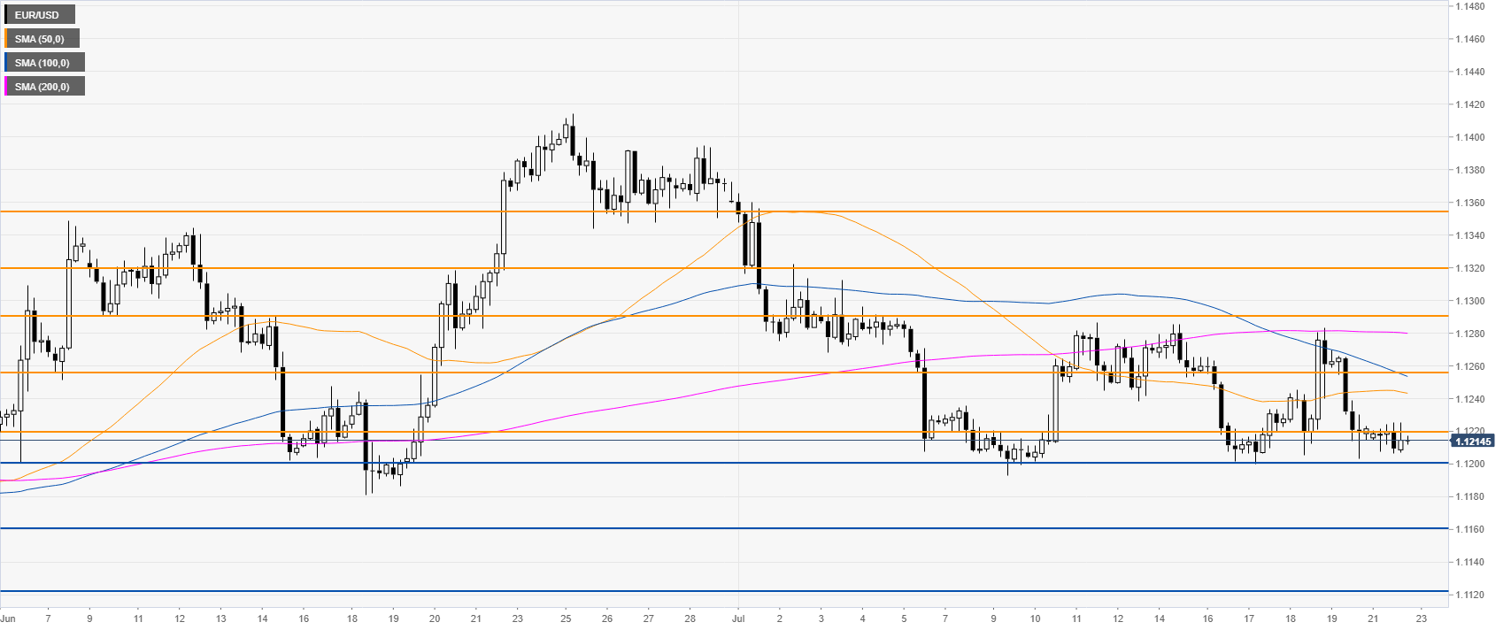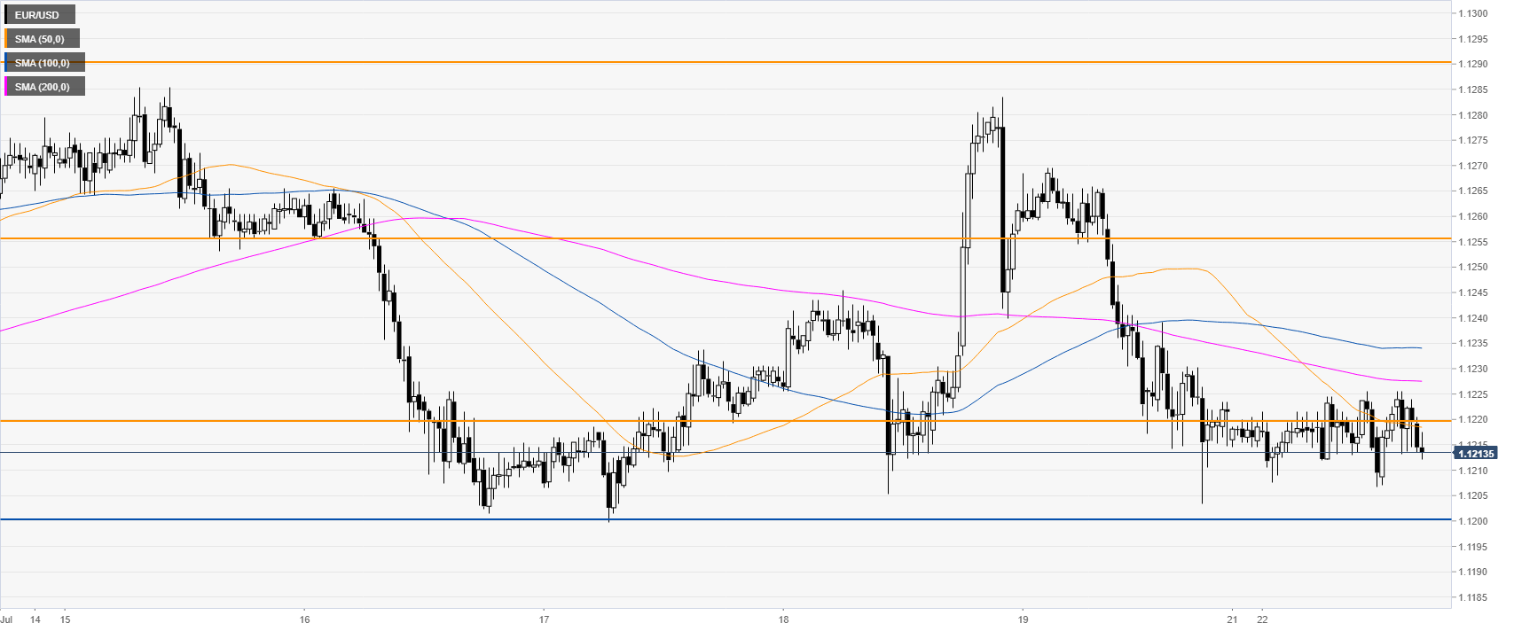 EUR/USD has been probing the 1.1220 resistance this Monday while trading below the main SMAs. Bears need a breakout below the 1.1200 level to reach 1.1160 and 1.1120 on the way down, according to the Technical Confluences Indicator.