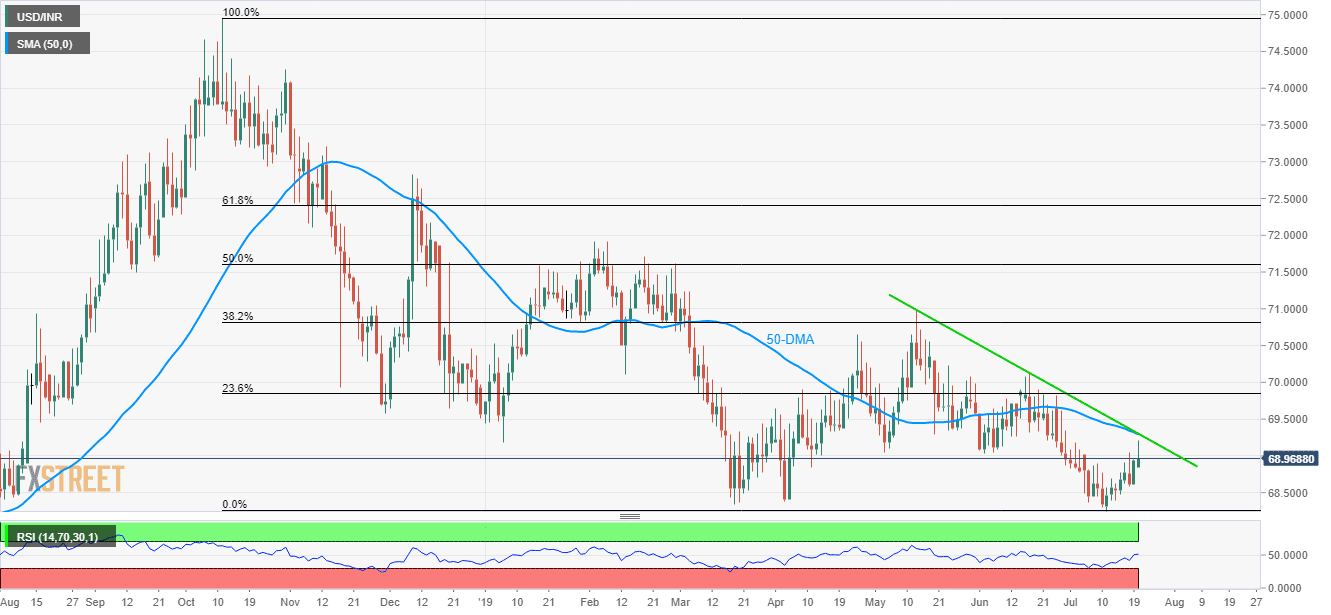 - 50-DMA, 9-week old descending trend-line questions the USD/INR pair’s latest recovery.