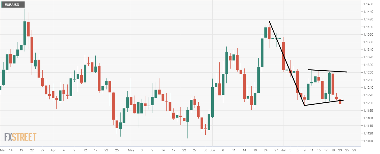 A daily close below 1.1204 would confirm flag breakdown and create room for a drop to fresh 2019 low below 1.1107.