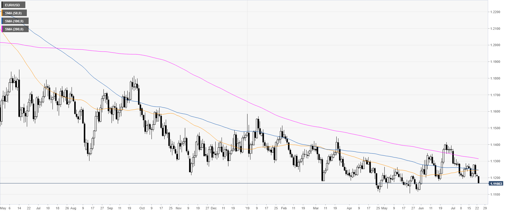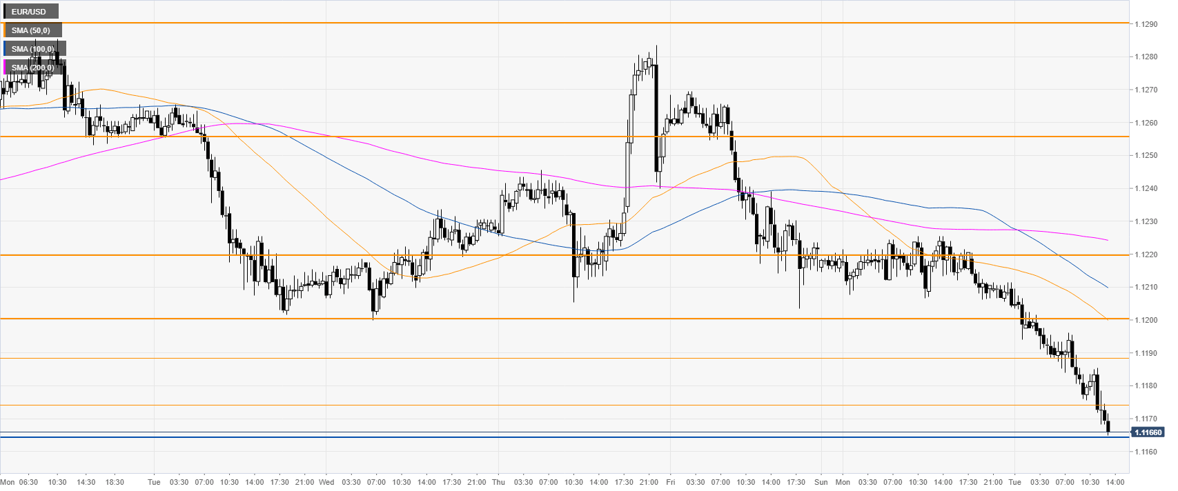 Sellers broke below the 1.1200 support as they are reaching 1.1165 support area. A break below the level can lead to 1.1100 and 1.1065 to the downside, according to the Technical Confluences Indicator.